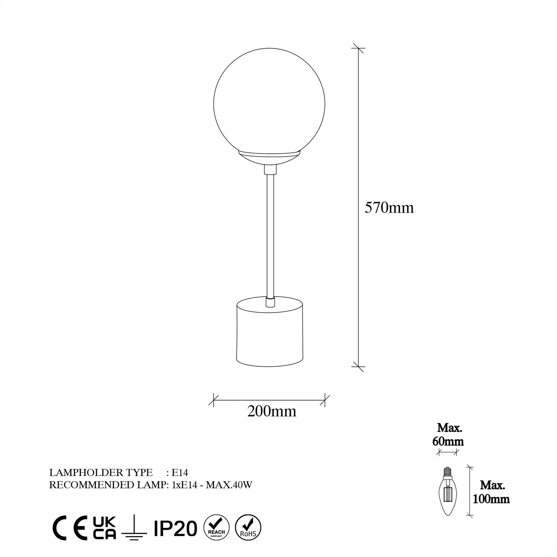 A placa de base do candeeiro tem um diâmetro de 13 cm e uma altura de 10 cm, proporcionando estabilidade e equilíbrio. O cabo de 200 cm de comprimento permite uma colocação flexível, dando-lhe a liberdade de posicionar o candeeiro onde desejar. A lâmpada foi concebida com uma classificação ip20, garantindo segurança e proteção contra o pó.