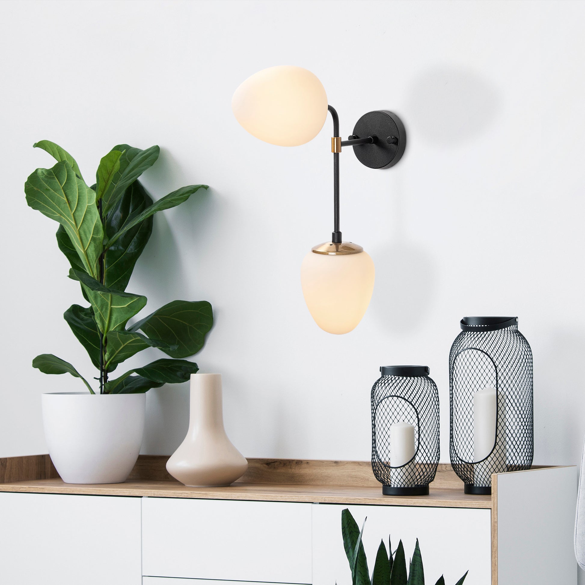 Candeeiro de Parede Elegante, Preta e Dourada com Detalhes em Creme, 46 cm de Altura | Corpo em Metal, Tampa de Vidro, IP20 | Ideal para Decoração Boêmia e Escandinava