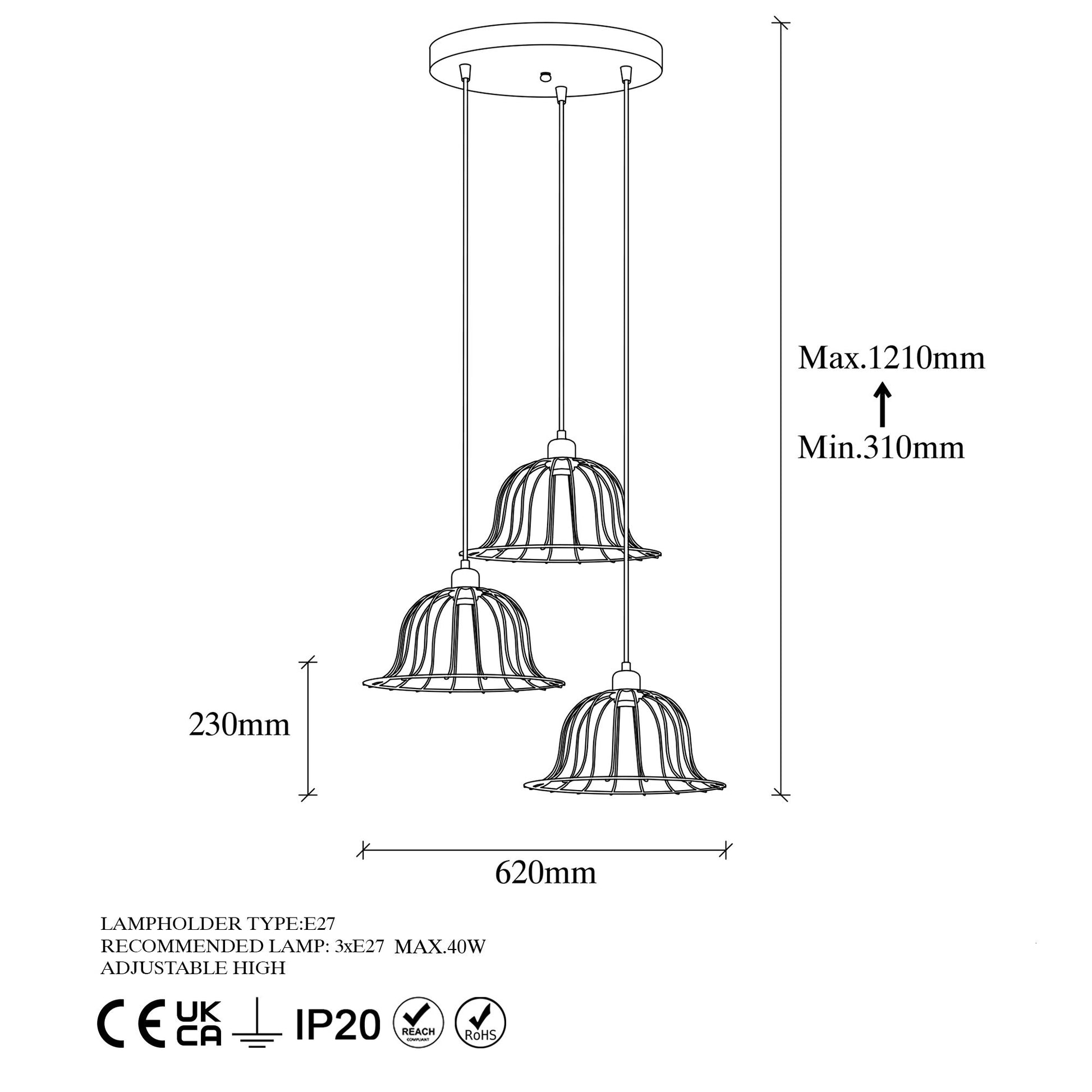 - Tipo de tomada: 3 x E27 Max 40 W para uma iluminação ampla