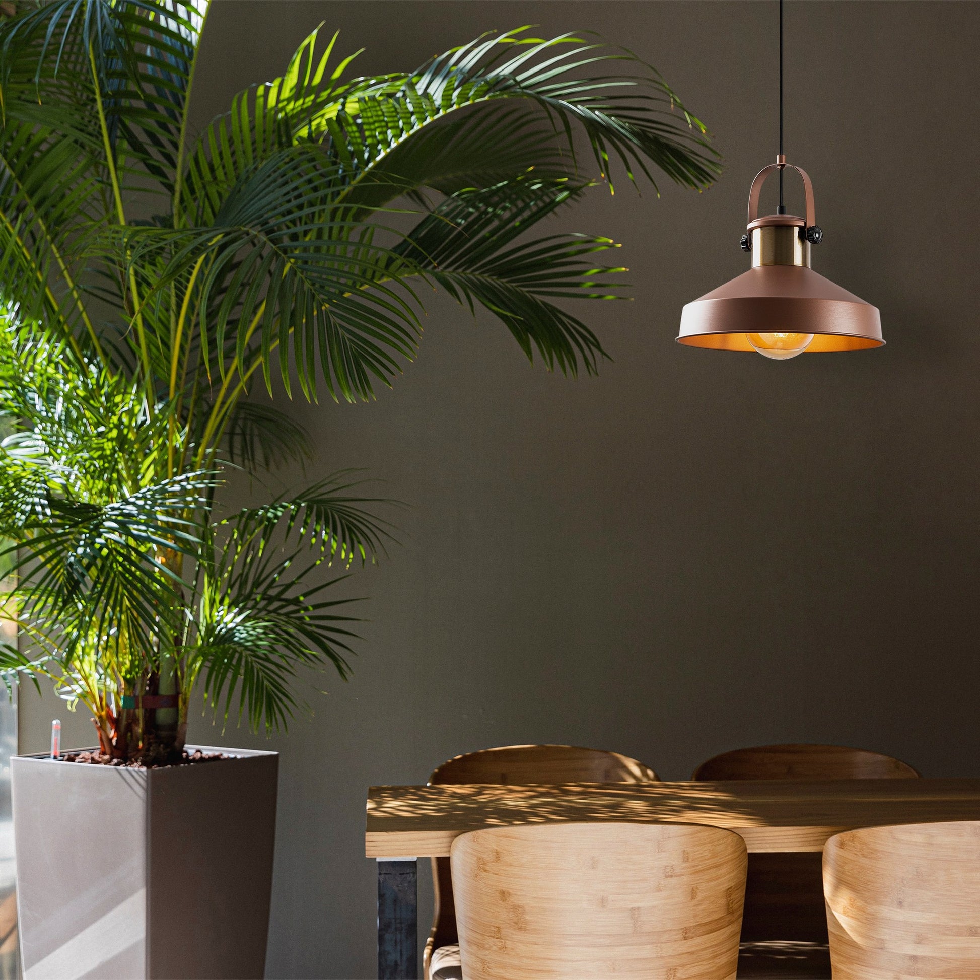 Com um corpo em metal, este candeeiro exala durabilidade e elegância. O acabamento em cobre confere um brilho quente e convidativo, criando um ambiente acolhedor em qualquer divisão. A altura ajustável permite-lhe personalizar a iluminação de acordo com as suas necessidades, tornando-o perfeito tanto para tectos altos como baixos.