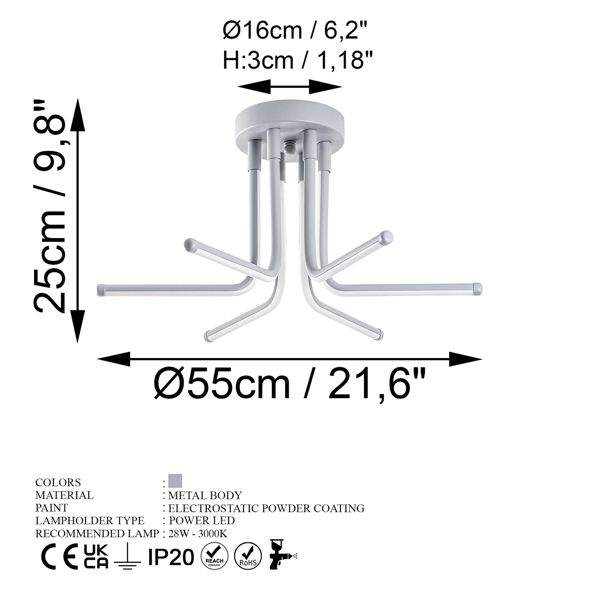 Candeeiro de Teto Cinza Elegante, Corpo de Metal, 55 cm de Largura x 25 cm de Altura | LED SMD 28W 3000K | Iluminação Elegante para Decoração e Ambiente Modernos