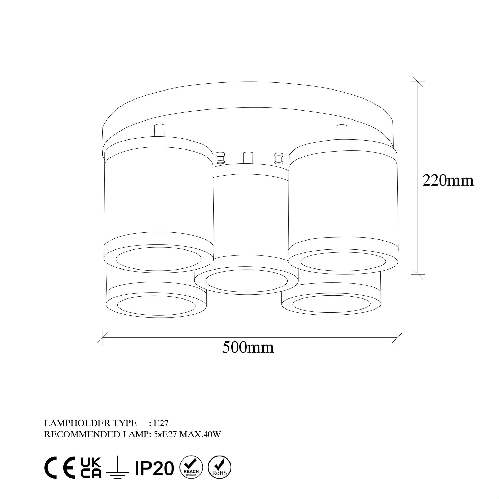 - Tipo de tomada: 5 x E27 Max 40 W, proporcionando amplas opções de iluminação