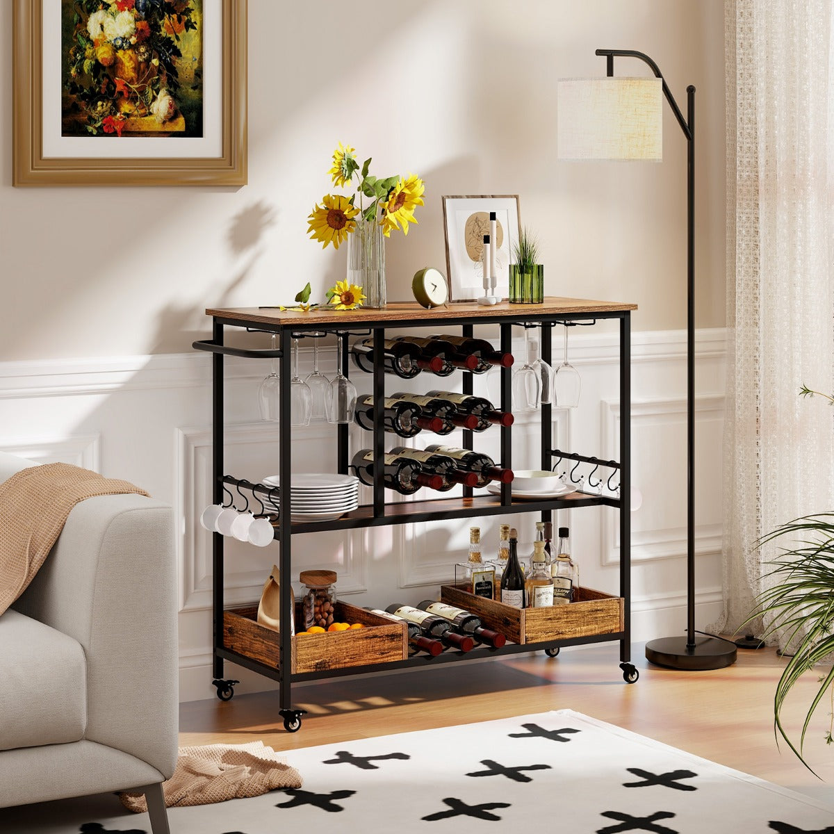 Aprecie a sua coleção de vinhos com o nosso carrinho de barra com rodas! Este carrinho para licores de 3 níveis pode armazenar vários copos e garrafas, garantindo que os seus vinhos favoritos estejam sempre ao seu alcance. Com áreas de armazenamento adicionais, como uma mesa espaçosa, 2 compartimentos abertos, 8 ganchos laterais e 2 caixas inferiores, tem muitas opções para organizar os seus itens essenciais. É fácil mover este carrinho de serviço doméstico com 4 rodas universais, 2 das quais podem ser bloqueadas para maior estabilidade. Além disso, a pega versátil também serve como um prático toalheiro. Suportado por uma estrutura de metal resistente, o carrinho de bebidas é durável. Além disso, o visual rústico e elegante adiciona um encanto intemporal à sua casa, seja na cozinha, na sala de jantar, na sala de estar ou mais.