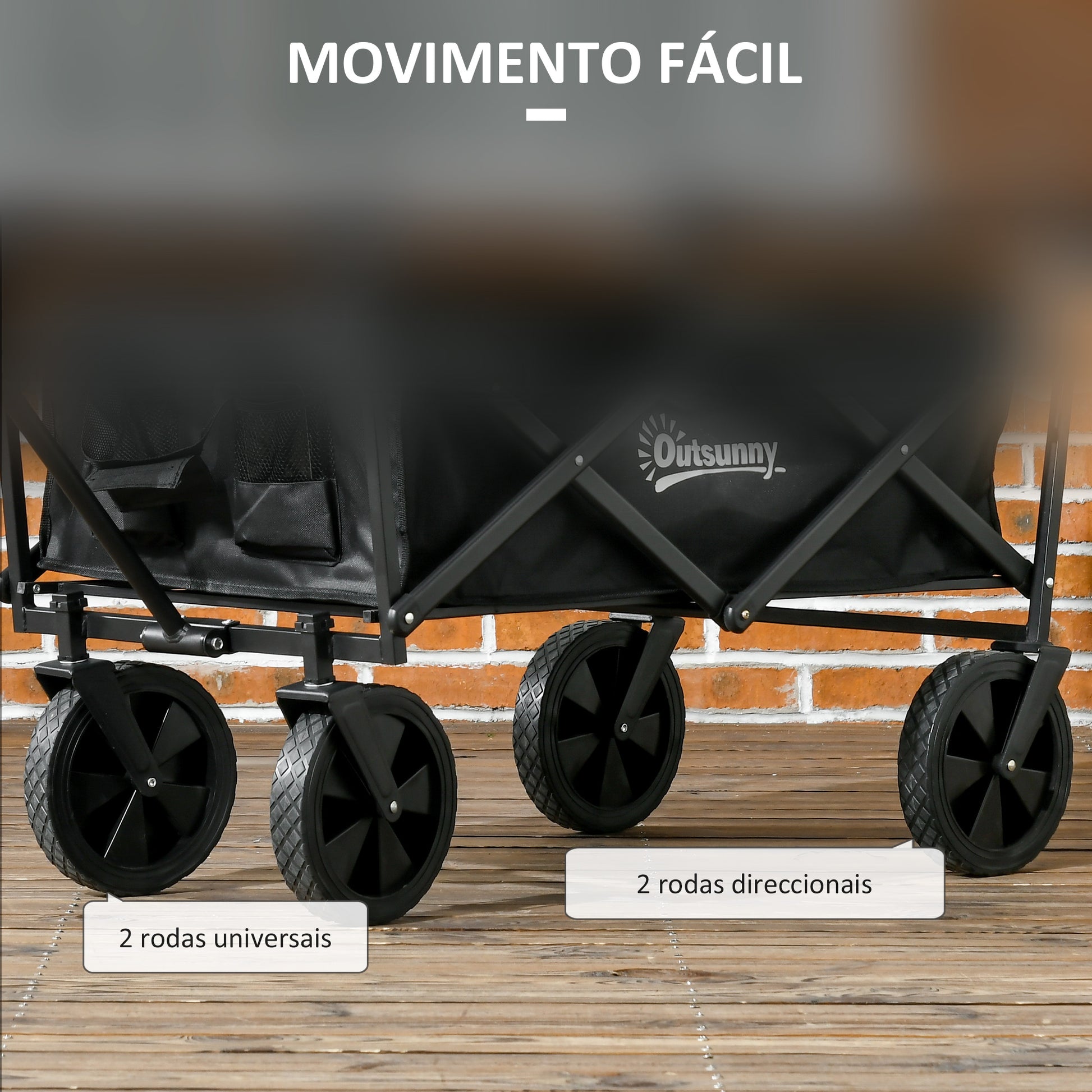 Este carrinho de transporte dobrável em preto é perfeito para múltiplas atividades, desde acampamentos até idas à praia.