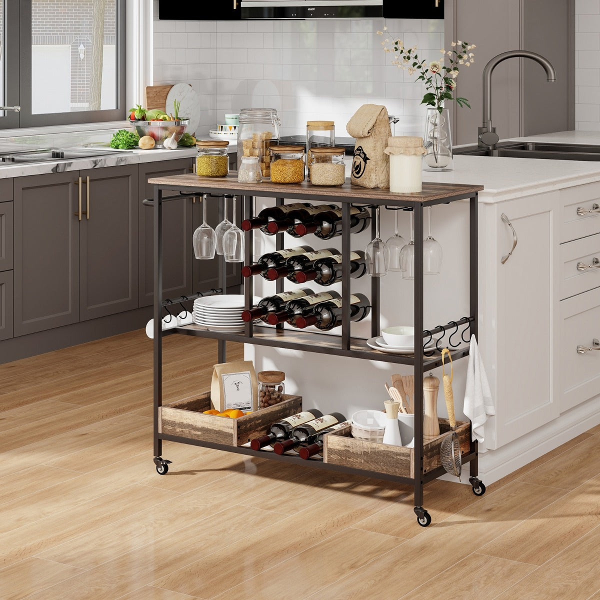 Aprecie a sua coleção de vinhos com o nosso carrinho de barra com rodas! Este carrinho de bebidas de 3 níveis pode armazenar vários copos e garrafas, garantindo que os seus vinhos favoritos estejam sempre ao seu alcance. Com áreas de armazenamento adicionais, como uma mesa espaçosa, 2 compartimentos abertos, 8 ganchos laterais e 2 caixas inferiores, tem muitas opções para organizar os seus itens essenciais. É fácil mover este carrinho de serviço doméstico com 4 rodas universais, 2 das quais podem ser bloqueadas para maior estabilidade. Além disso, a pega versátil também funciona como um prático toalheiro. Suportado por uma estrutura de metal resistente, o carrinho de bebidas é robusto. Além disso, o visual rústico e elegante adiciona um charme intemporal à sua casa, seja na cozinha, na sala de jantar, na sala de estar ou em qualquer outro espaço.