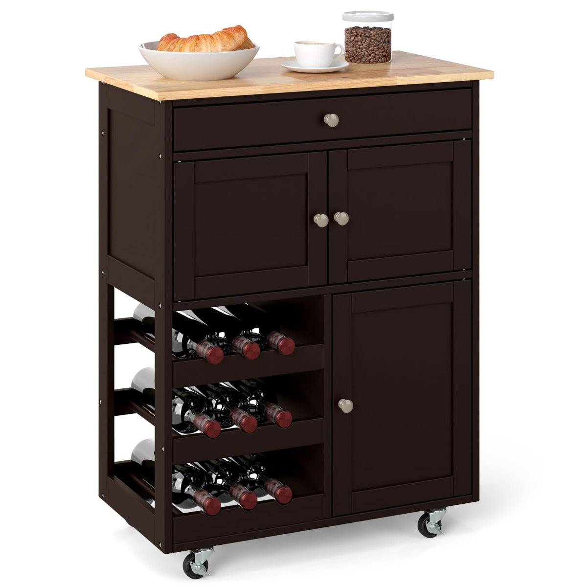 Carrinho de Cozinha Ilha com Superfície em Madeira de Borracha Gaveta Garrafeira com 3 Níveis 2 Armários Castanho