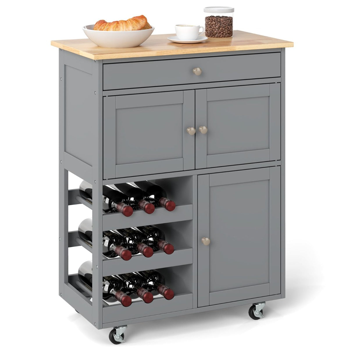 Carrinho de Cozinha Ilha de Cozinha com Superfície de Madeira de Borracha Gaveta Suporte para Garrafas com 3 Níveis 2 Armários Cinzento