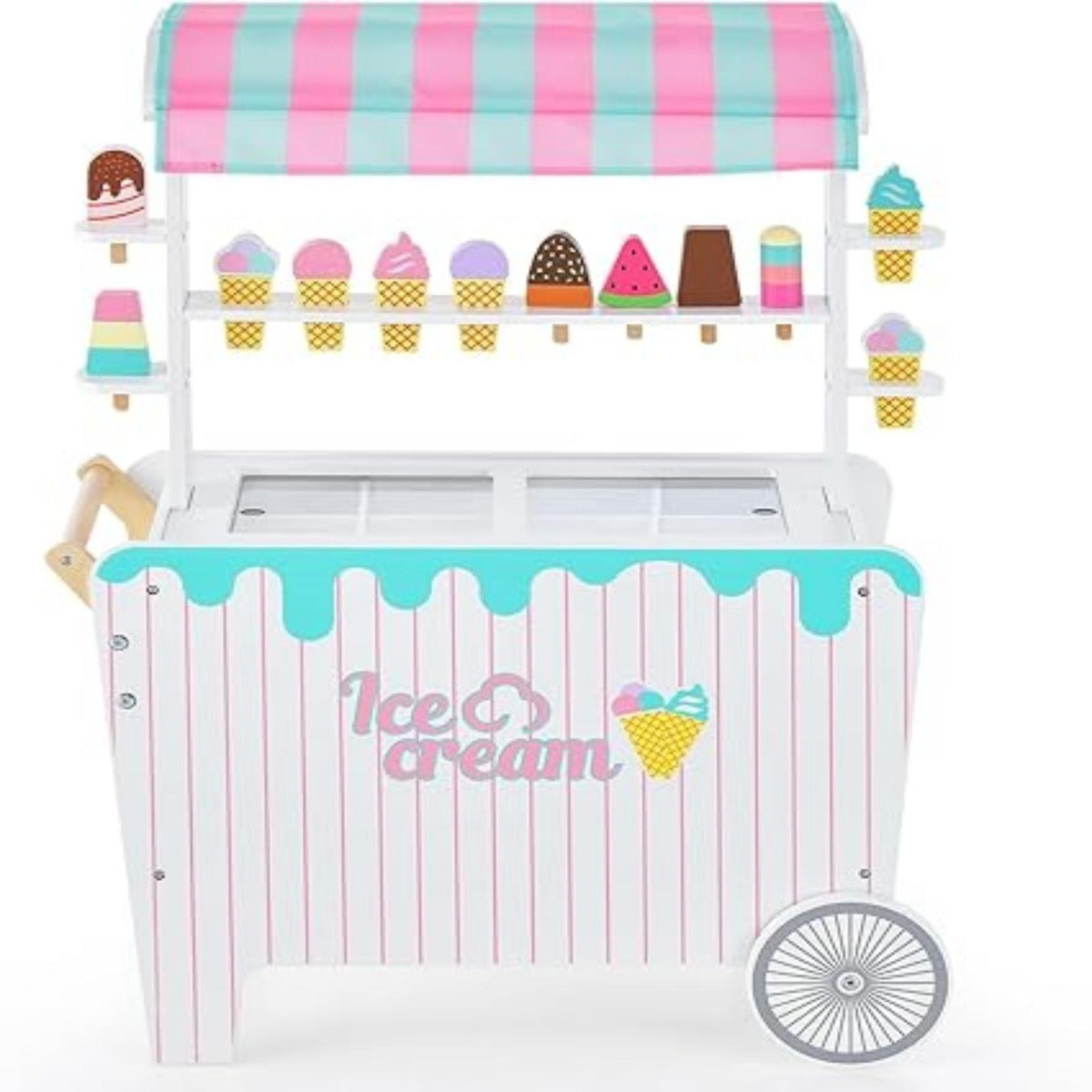 Carro de Gelados de Brincar com 12 Acessórios - Carroça de Madeira para Crianças a Partir dos 3 Anos