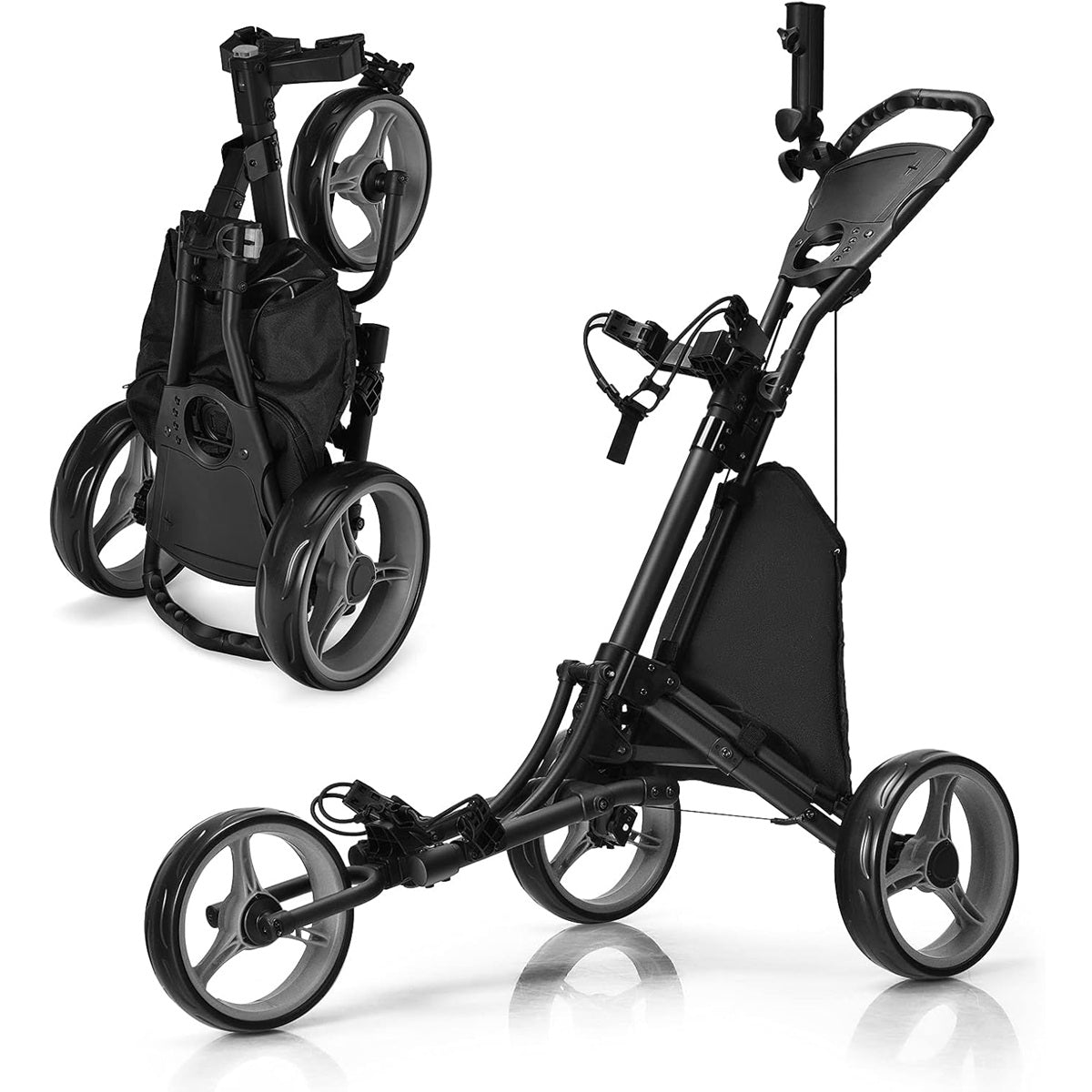 - Rodas Funcionais: Graças às suas 3 rodas com rolamentos de esferas cobertas com espuma EVA, pode mover este carrinho de golfe de luxo de forma suave e estável na maioria dos tipos de terreno. Quando não estiver em uso, basta pressionar o travão traseiro e o carrinho permanecerá no lugar, permitindo-lhe jogar com tranquilidade.