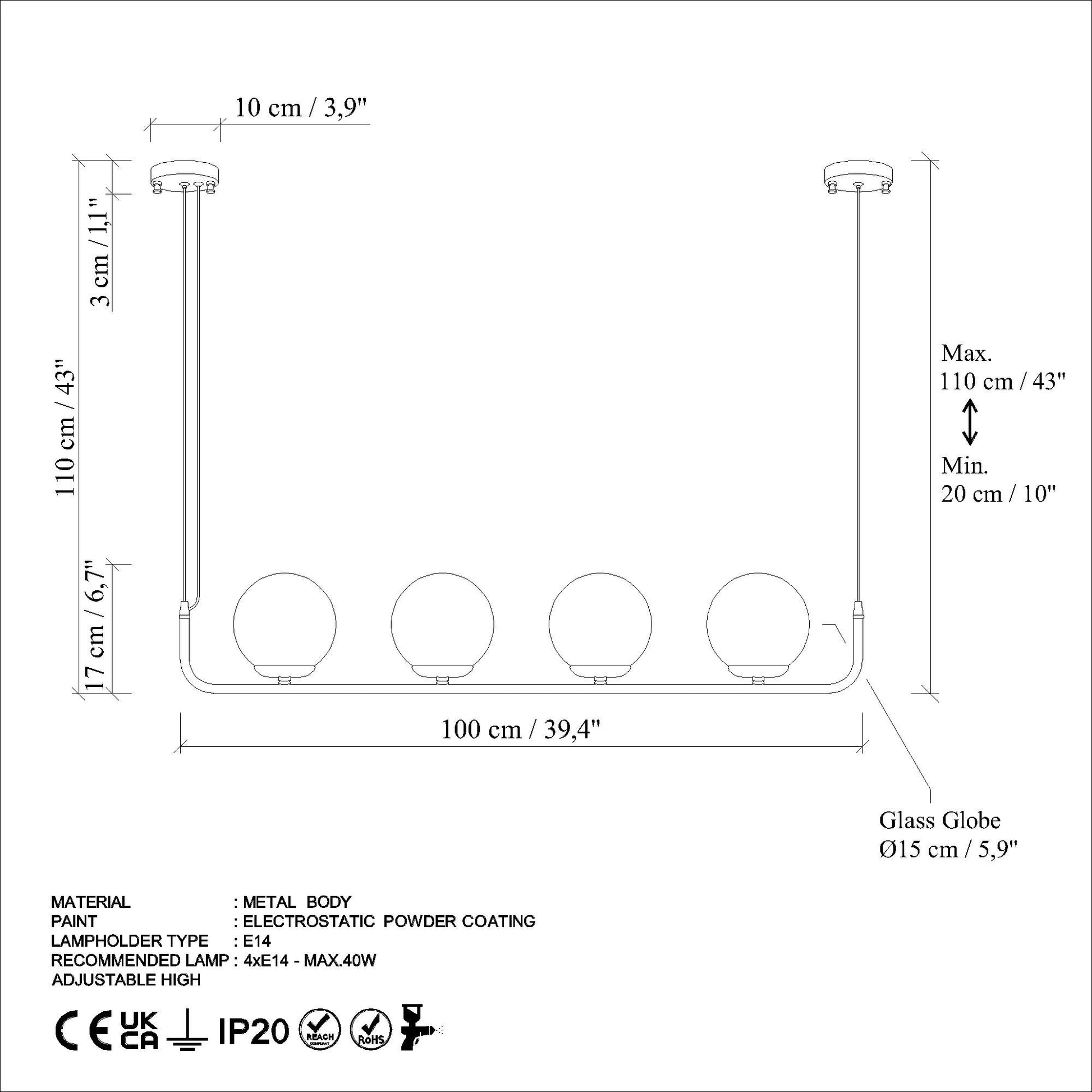 Candeeiro de Teto branco elegante, altura ajustável de 20 a 110 cm, corpo de metal, 4 soquetes E14, diâmetro da tampa de 15 cm, perfeito para espaços modernos, classificação IP28