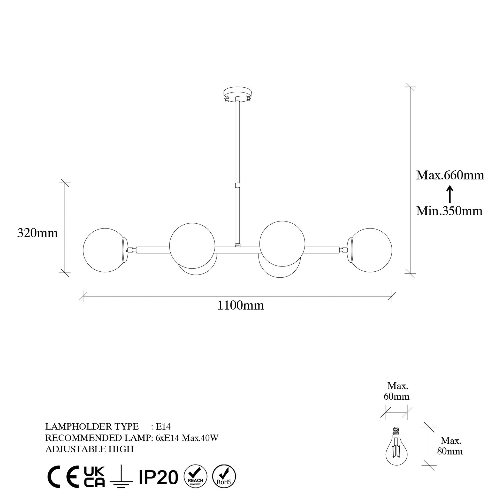 Ilumine o seu espaço com o brilho cativante do nosso candeeiro. As seis tomadas e14 permitem uma iluminação ampla, criando uma atmosfera calorosa e convidativa. Quer esteja a organizar um jantar ou a desfrutar de uma noite tranquila em casa, este candeeiro irá criar o ambiente perfeito para qualquer ocasião.