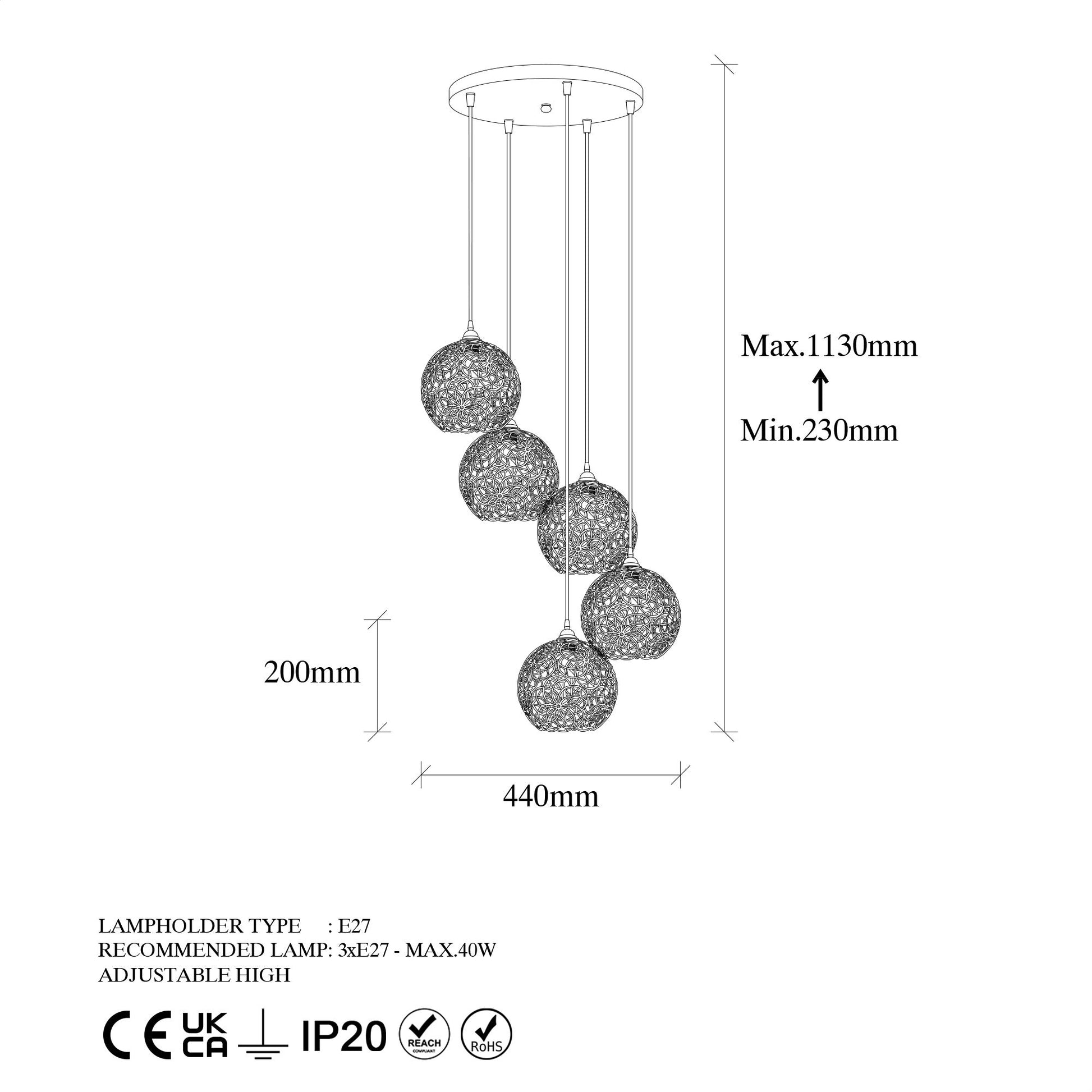 - Tipo de tomada: 5 x E27 Max 40 W para opções de iluminação versáteis