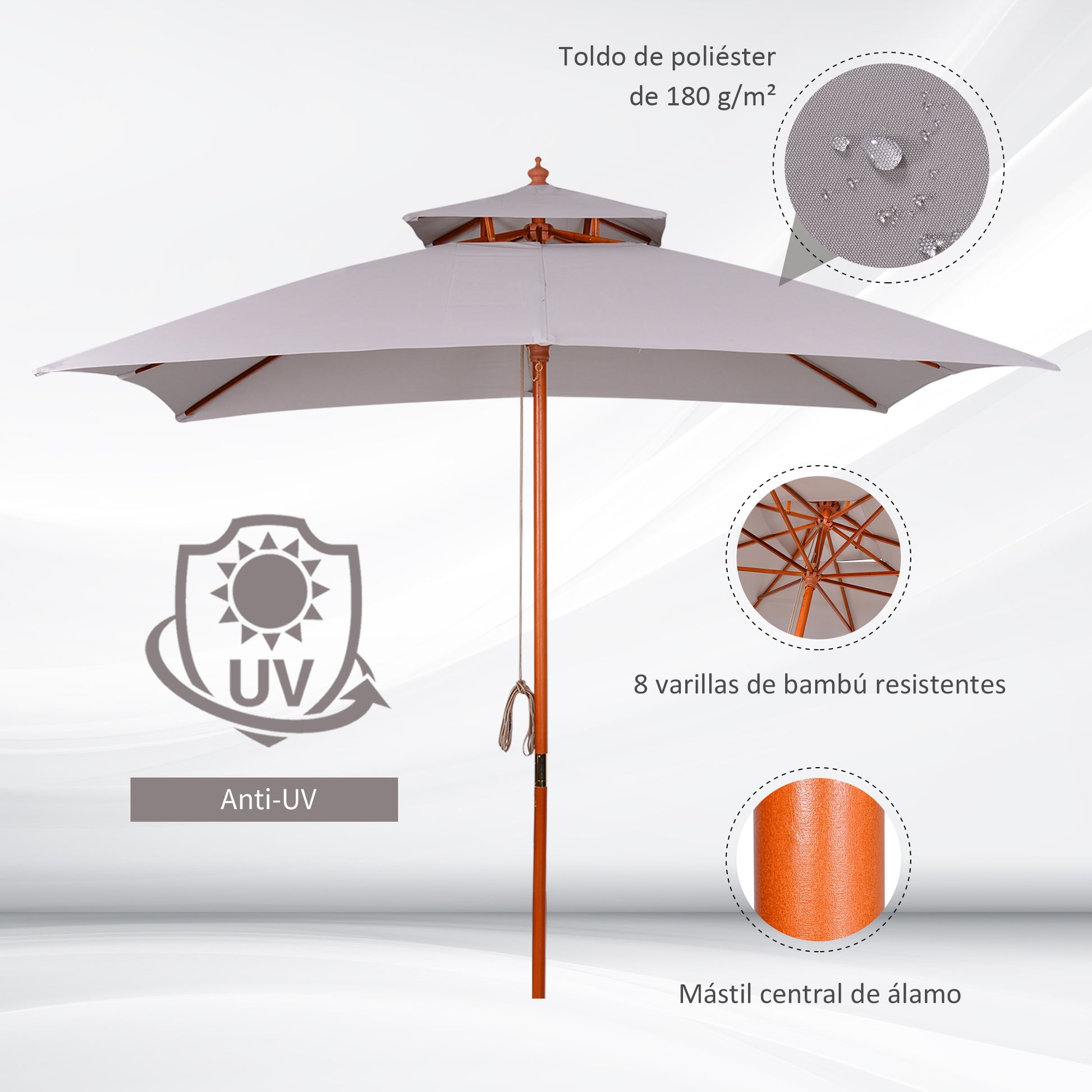 - Materiais: Estrutura de madeira de álamo e bambu, toldo de poliéster durável