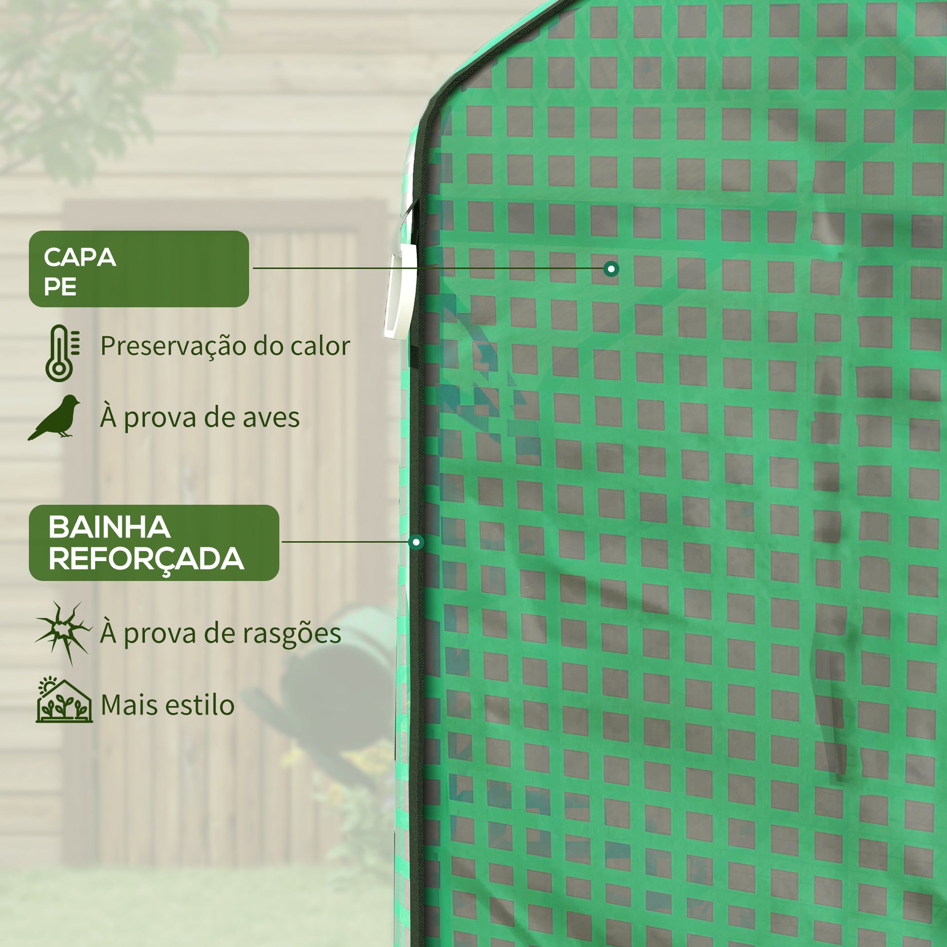 - Benefícios: Resistente aos raios UV, permite a passagem de 85% da luz solar, porta com fecho éclair, janelas de rede para ventilação e bordas estendidas para maior estabilidade.