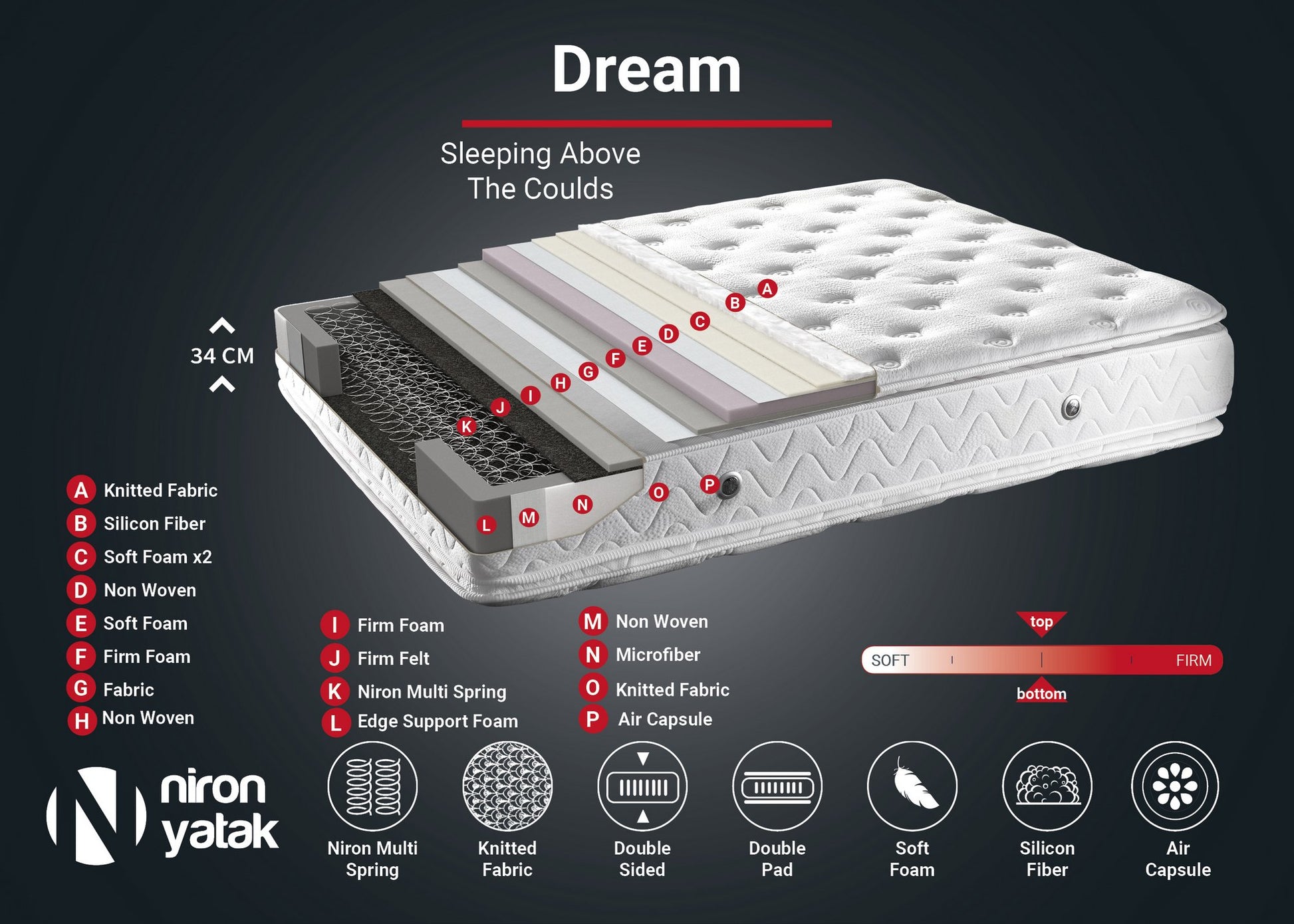 O colchão de sonho foi especialmente concebido para lhe proporcionar a melhor experiência de sono. A sua estrutura duplamente almofadada garante o máximo conforto e apoio, permitindo-lhe acordar com uma sensação de frescura e rejuvenescimento. O nível médio de firmeza atinge o equilíbrio perfeito entre suavidade e apoio, embalando o seu corpo em todos os sítios certos.