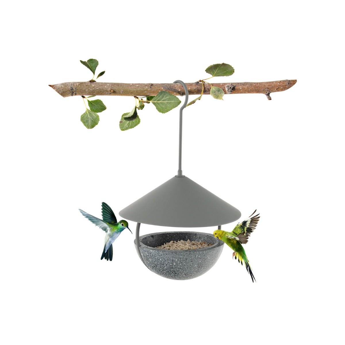 O comedouro perfeito para os amantes de aves! Feito de uma cúpula de metal e base de resina, o comedouro para pássaros é resistente e durável para uma longa vida útil. Resistente à neve, chuva e vento, é a escolha ideal para os amantes de aves. Pode ser pendurado numa árvore ou viga da casa, permitindo desfrutar da presença de belas aves no quintal, alpendre ou jardim durante todo o ano. Com um design que permite encher facilmente o comedouro com comida e água, este comedouro de pássaros é de montagem rápida e simples, sendo também fácil de limpar.