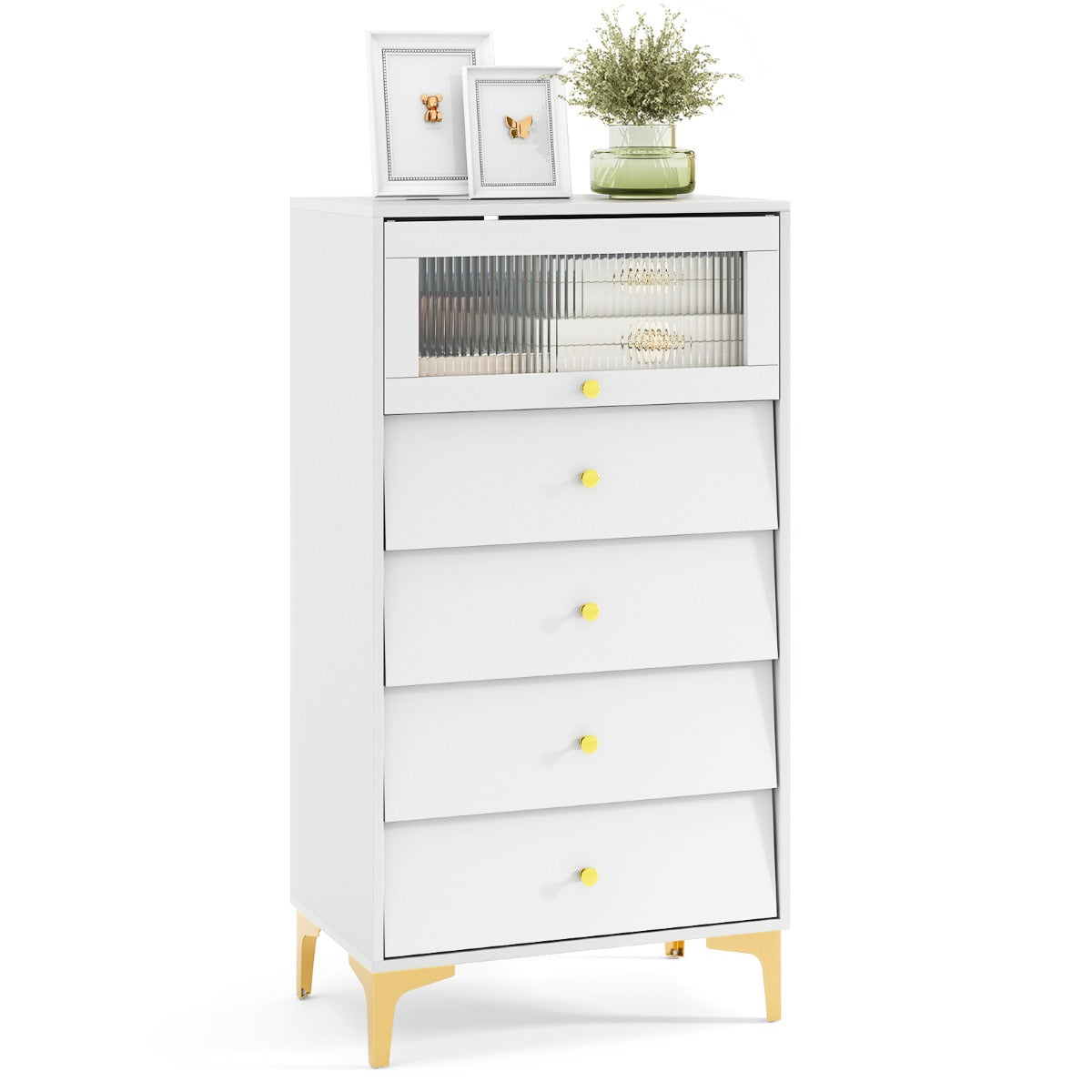 Cómoda com 3/4 Gavetas Armário Moderno com Porta de Vidro Canelado e Gavetas Extraíveis Pernas Metálicas-4 Gavetas