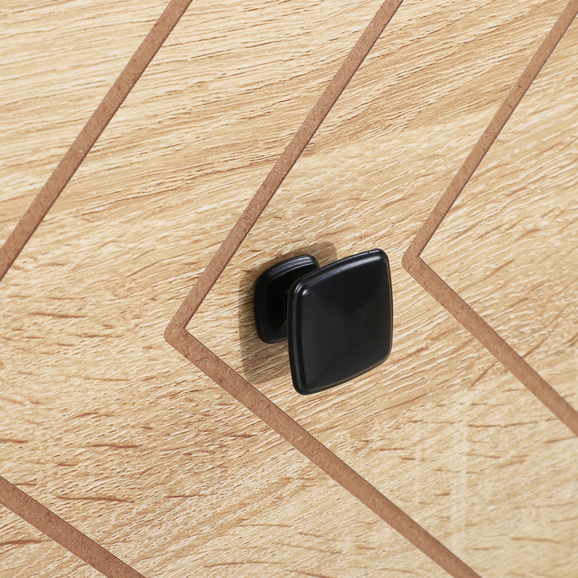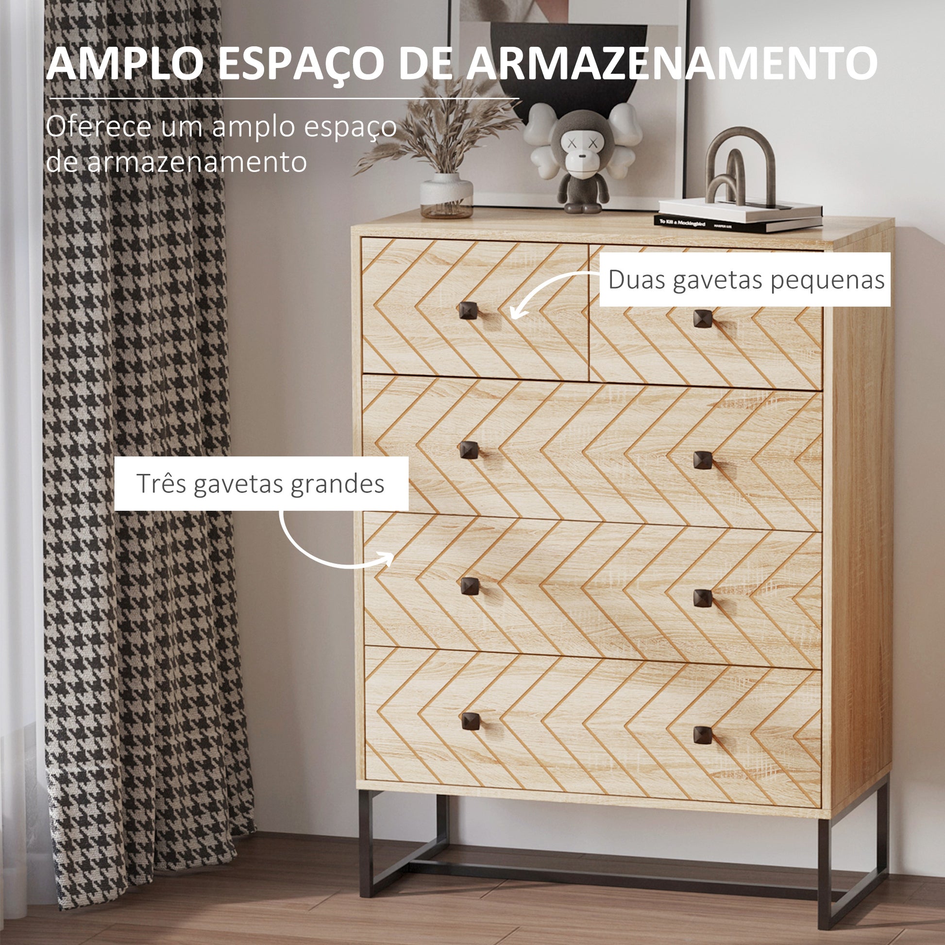 - Benefícios: As 5 gavetas, sendo 3 grandes e 2 pequenas, permitem organizar objetos de diferentes tamanhos, enquanto o padrão geométrico em madeira e preto confere um toque de elegância.