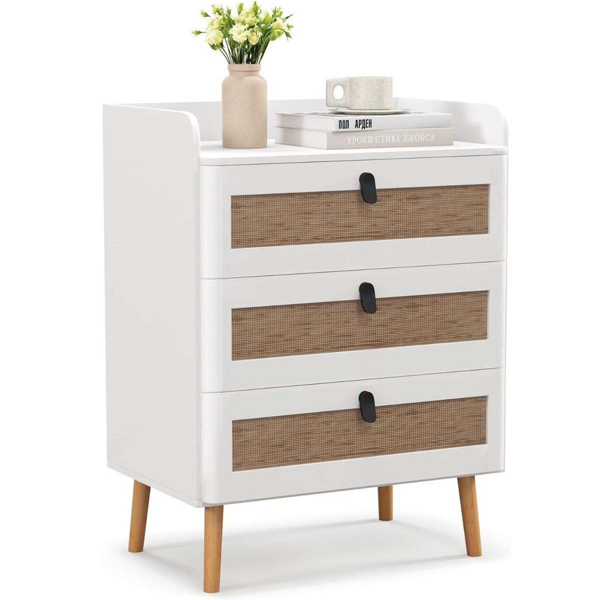 - Ampla capacidade de armazenamento: com 3 grandes gavetas em rattan e uma ampla bandeja, esta cómoda oferece espaço suficiente para guardar chávenas, livros, cabos de carregamento e outros artigos necessários. Destaque para o bordo elevado da bandeja, que evita a queda de objetos.