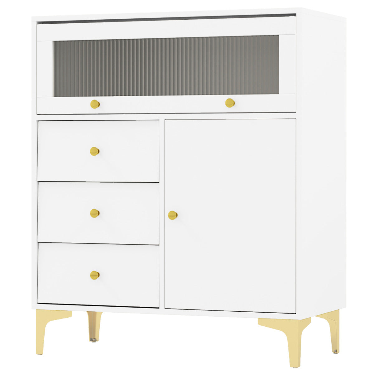Cómoda de Quarto Gabinete de Arrumação Moderno com Porta de Vidro Canalizado Abatível e Gavetas Extraíveis Pernas de Metal Branco