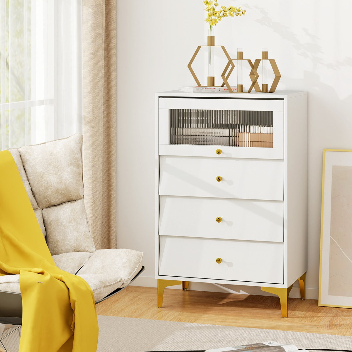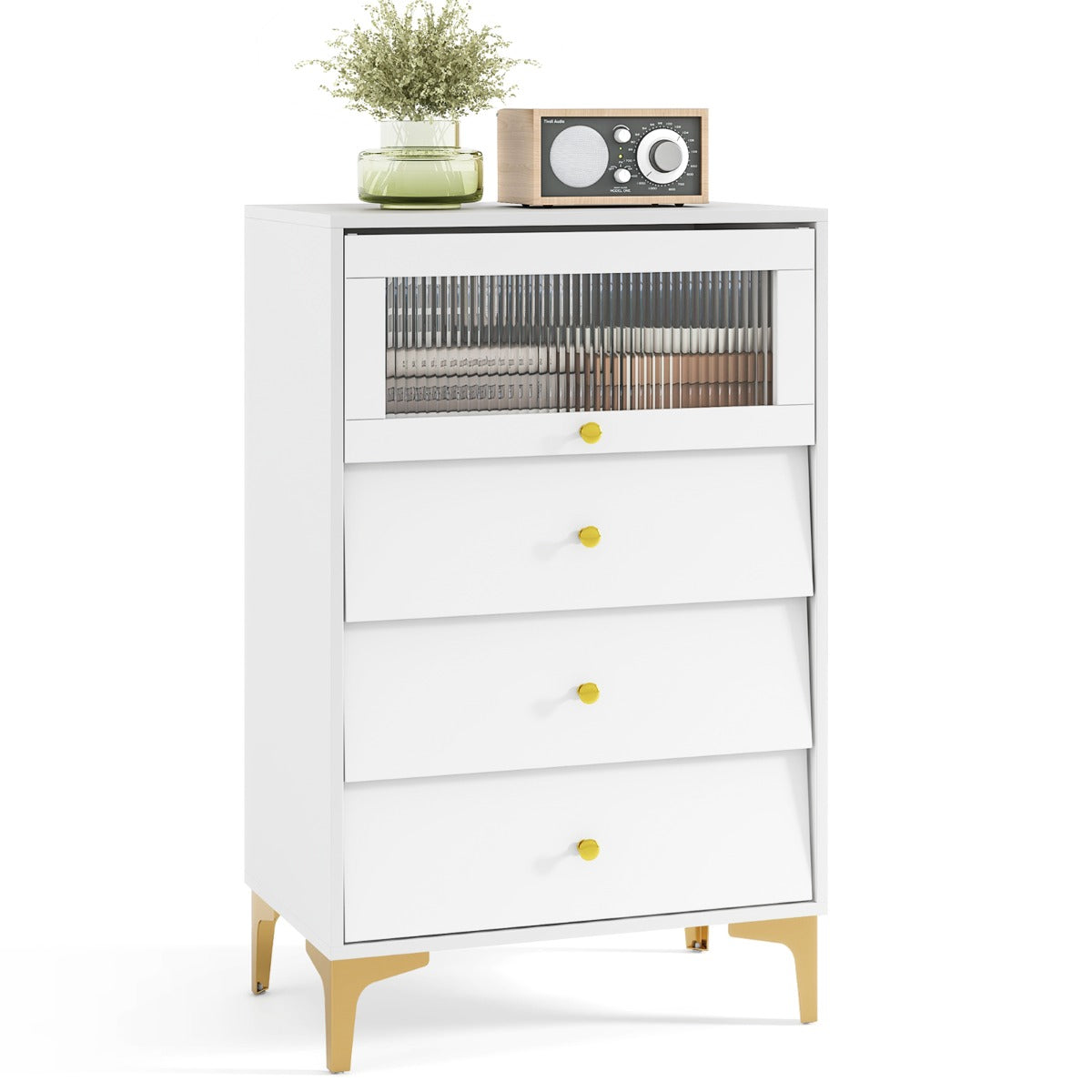 Esta cómoda foi concebida com 3/4 gavetas grandes e 1 pequeno armário para armazenar os seus pertences. Com pernas metálicas em forma de L e design antivuelco, o armário permanecerá estável e firme. Além disso, a porta de vidro basculante permite um acesso fácil. Os práticos puxadores e corrediças metálicas ajudam a abrir as gavetas facilmente. A porta de vidro canelado e as frentes inclinadas das gavetas conferem um toque elegante ao seu espaço. Pode ser colocado em quartos, corredores ou entradas. Além disso, é fácil de montar e limpar.