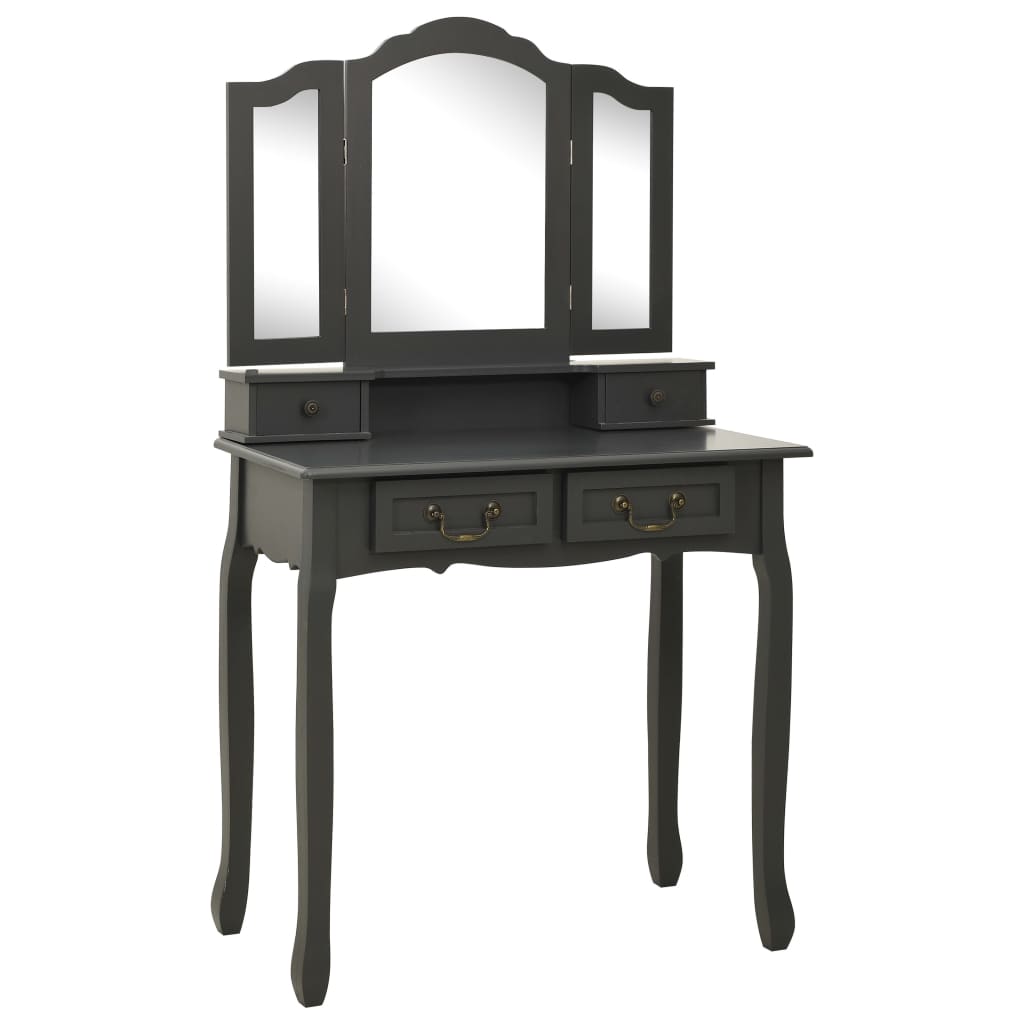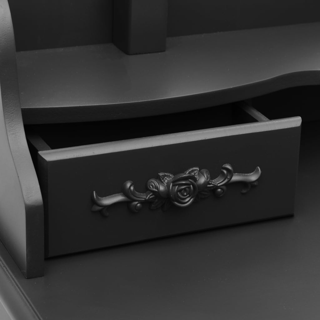 Este toucador elegante, feito em madeira de paulownia selecionada, apresenta um perfil único e quatro pernas em forma de garras com um estilo luxuoso. Quatro gavetas de tamanhos diferentes e um compartimento aberto oferecem o espaço perfeito para guardar a maquilhagem e as joias. O tampo também é uma excelente superfície para expor frascos de perfume ou outras decorações. O banco incluído possui um assento acolchoado sem encosto e uma base de madeira a combinar. O espelho embutido destaca uma silhueta bem elaborada para um toque contemporâneo.