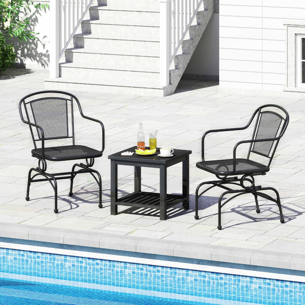 Conjunto de 2 Cadeiras de Baloiço para Exterior com Encosto e Assento em Malha Metálica Apoios de Braços Confortáveis Almofadas Ajustáveis Preto