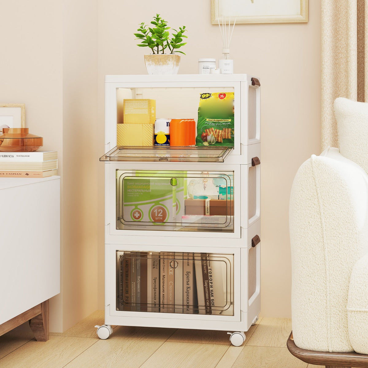 Estas versáteis caixas de armazenamento oferecem amplas capacidades (105 L), perfeitas para organizar livros, roupa, toalhas, snacks e muito mais. O design de 3 níveis permite um armazenamento vertical enquanto mantém os objetos organizados. Graças à sua estrutura dobrável, estas caixas podem ser dobradas quando não estão a ser utilizadas, sendo uma solução ideal para espaços reduzidos. Com duas opções de abertura, fecho magnético seguro e pegas práticas, aceder aos teus pertences será mais fácil do que nunca. Fabricadas com plástico resistente a impactos, estas caixas de armazenamento garantem grande durabilidade. Além disso, vêm com 4 rodas universais para movimentação fácil e estabilidade ótima.