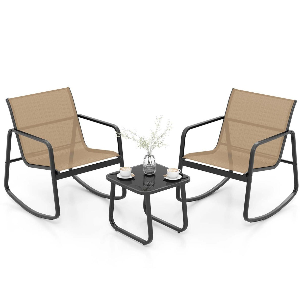 Conjunto de 3 Peças Baloiço para Pátio 2 Cadeiras de Bistrô e Mesa Baixa de Vidro com Tecido de Malha Respirável Faixa Antiderrapante Castanho