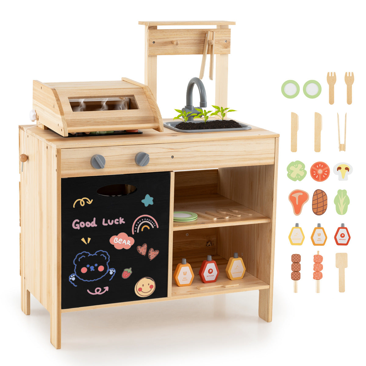 Fabricado com madeira de abeto de confiança, este conjunto de cozinha de imitação para churrasco está construído para durar. As crianças podem divertir-se a lavar legumes na pia e a grelhar no churrasco, com comida e utensílios para uma experiência de culinária realista. A ardósia com giz e apagador acrescenta outro elemento de diversão. Quando o tempo de brincadeira termina, as crianças podem arrumar os acessórios no espaço de armazenamento incorporado. Este conjunto de churrasco de madeira é um excelente presente para crianças com mais de 3 anos, proporcionando horas de entretenimento sem fim.