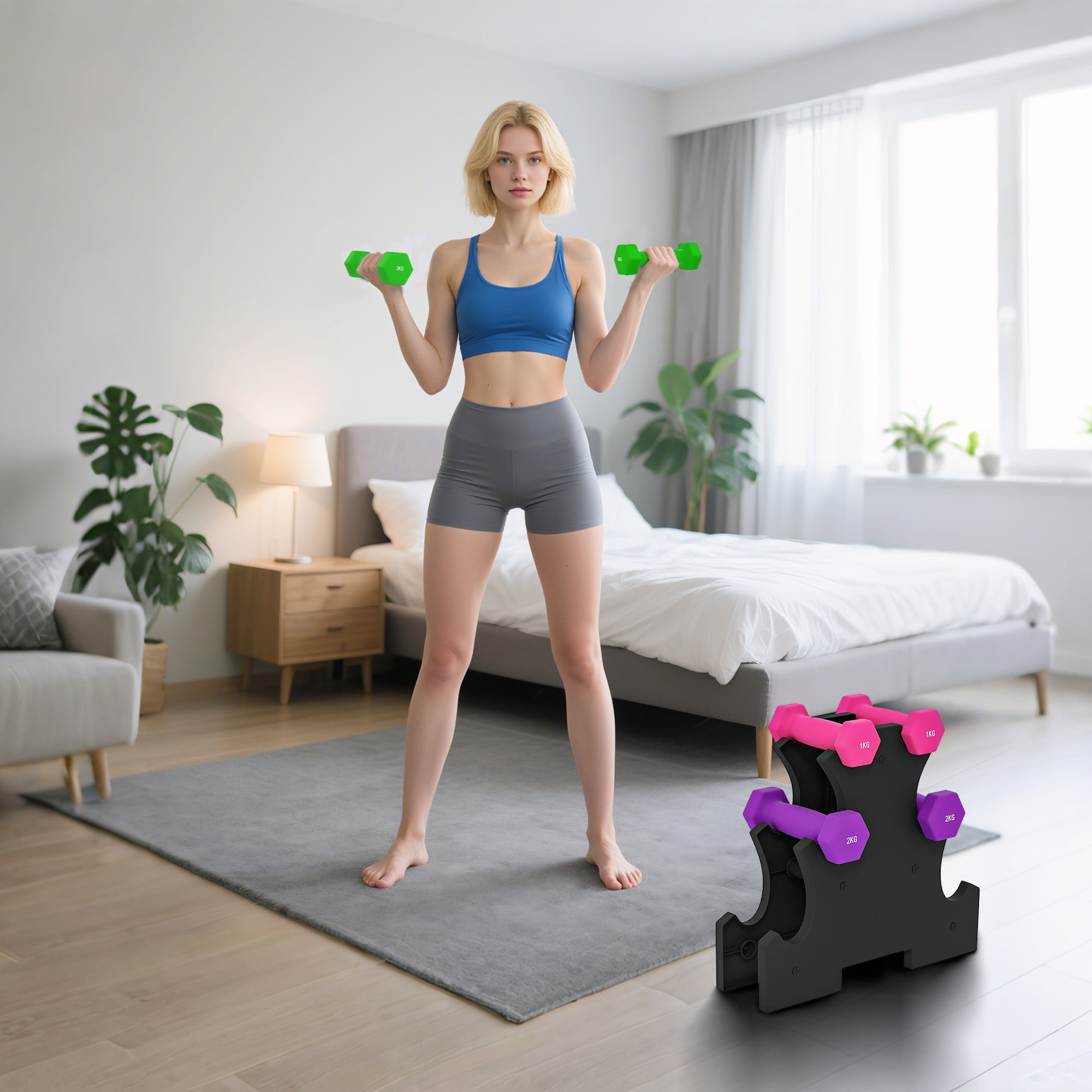 Transforme o seu espaço de treino em casa com este conjunto de halteres hexagonais em tons de rosa, roxo e verde. O jogo inclui 6 peças: 2 halteres de 1 kg, 2 halteres de 2 kg e 2 halteres de 3 kg, acompanhados por um suporte de armazenamento. Mantenha os seus pesos organizados e acessíveis, otimizando o espaço da sua área de treino em casa.
