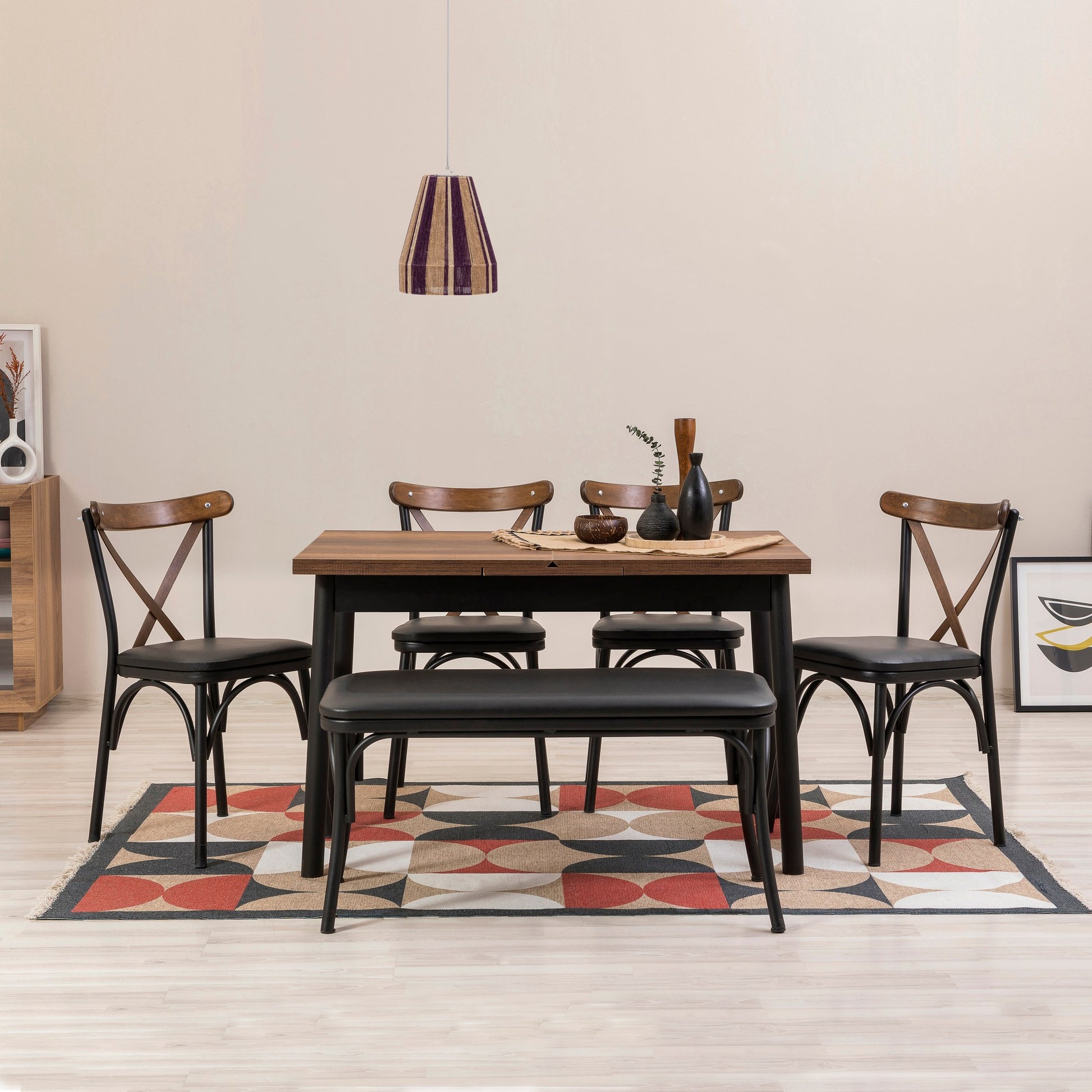 Conjunto de mesa de jantar extensível e cadeiras (6 peças), preto, 120-153 x 75 x 77 cm | 100% revestido em melamina, tecido couro sintético, pernas de madeira de faia | Elegante e funcional para refeições modernas