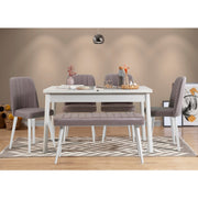 Transforme sua sala de jantar em um espaço aconchegante e estiloso com nosso Conjunto de Mesa de Jantar Extensível e Cadeiras. Feito com 100% de aglomerado revestido de melamina e pernas de madeira, este conjunto exala qualidade e durabilidade. O design elegante e a paleta de cores neutras em branco e cinza fazem dele uma adição perfeita para qualquer casa moderna.