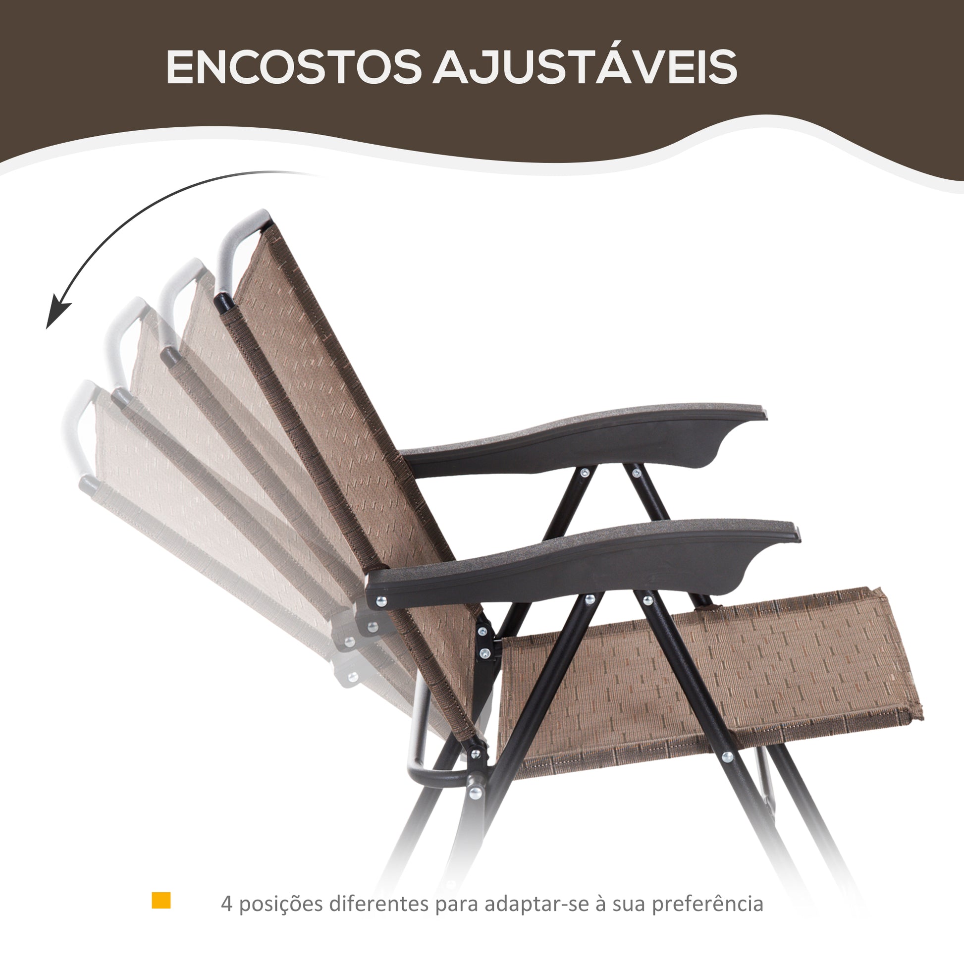- Benefícios: Design moderno e elegante que se adapta a qualquer decoração. Cadeiras dobráveis para poupar espaço de armazenamento. Encosto reclinável em 4 níveis e apoio de braços para maior conforto.