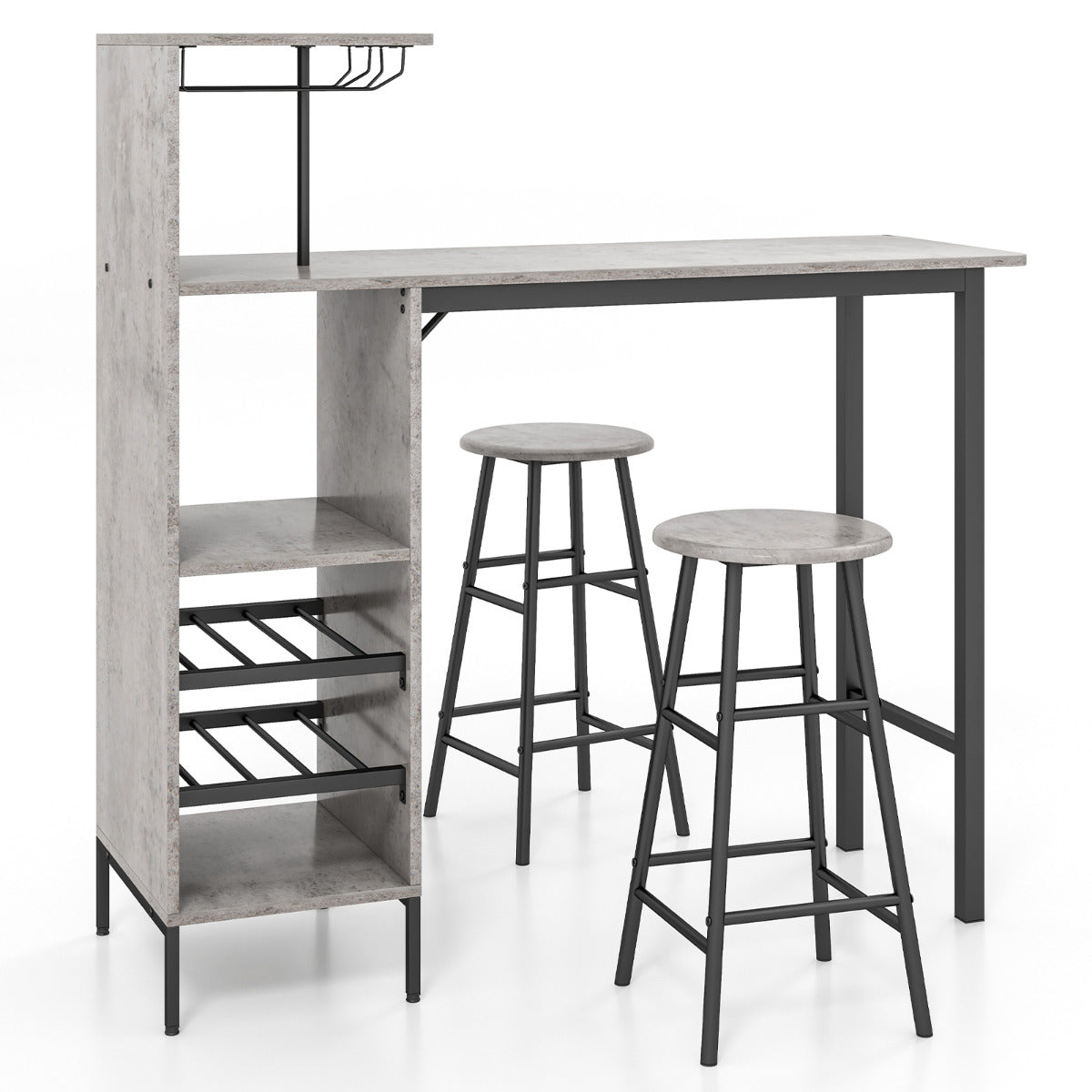 Conjunto de Mesa e Cadeiras de Bar Industrial de 3 Peças com Suportes para Copos Estantes para Sala de Jantar Cozinha Cinzento