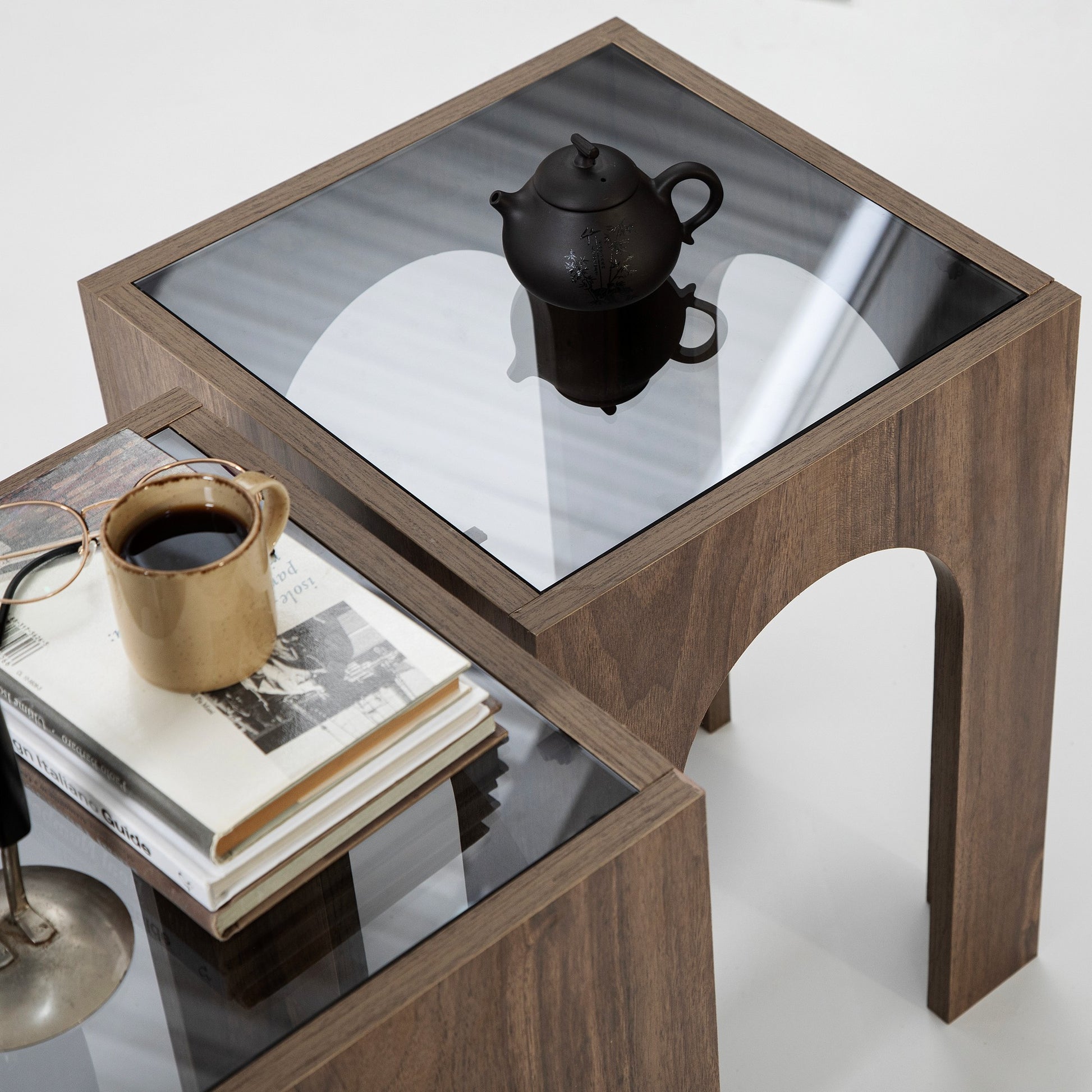 Conjunto de mesa de centro elegante (2 peças), nogueira e cinza escuro, 35 x 50/55 cm | 100% vidro temperado, aglomerado revestido de melamina de 18 mm | Design moderno e elegante