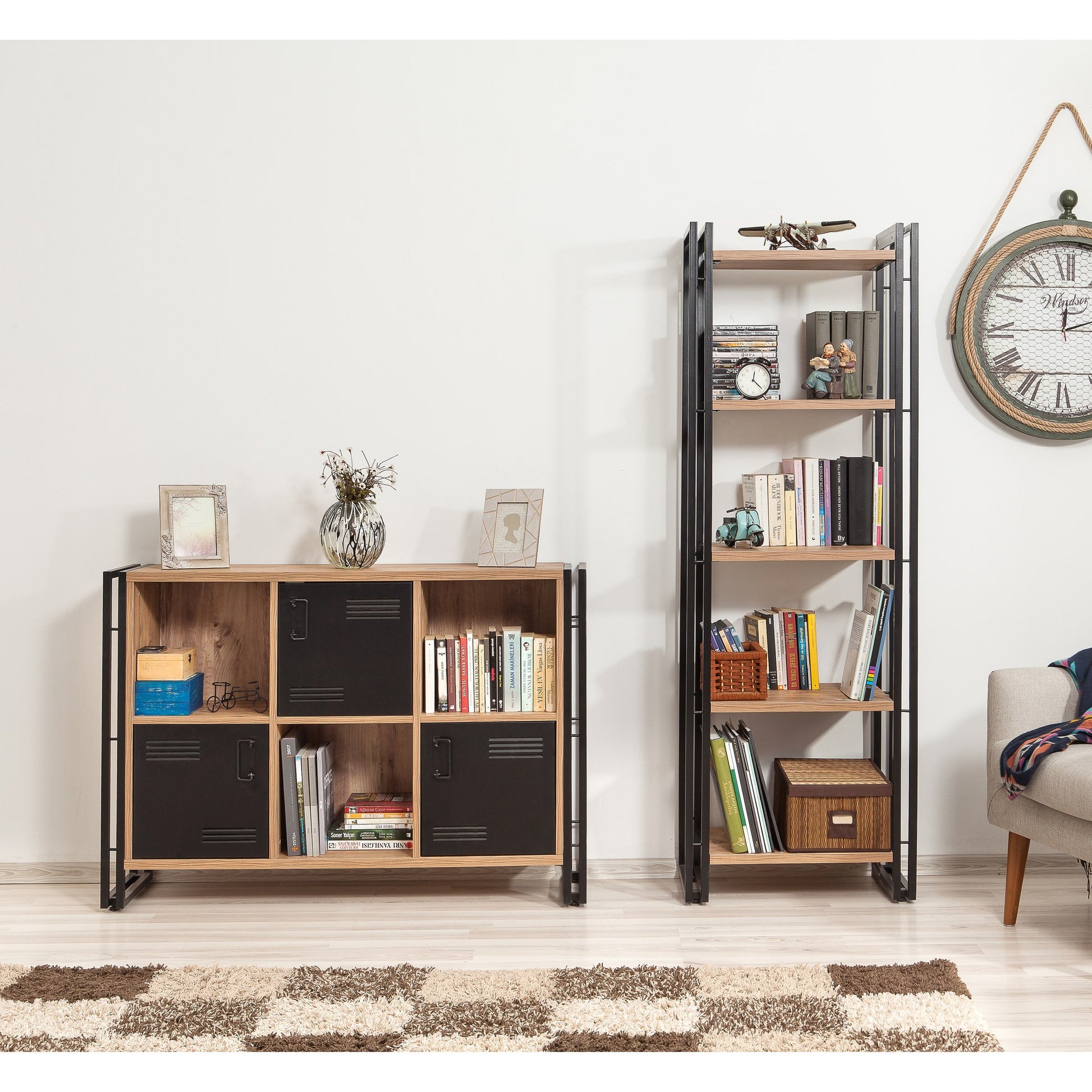 Conjunto de móveis elegantes para sala de estar, pinho atlântico e preto, 100% revestido em melamina, 18 mm de espessura, estrutura de metal, estante 60 x 180 x 35 cm, Tribus 136 x 89 x 35 cm