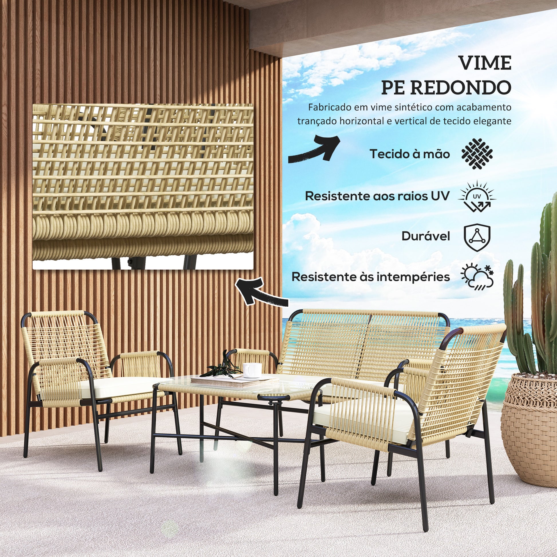 - Benefícios: Almofadas macias e acolchoadas, resistente às intempéries, fácil de limpar, durável
