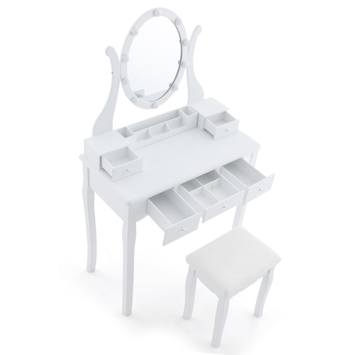 Este conjunto de tocador inclui um espelho giratório iluminado com LED e uma banqueta almofadada. O espelho LED possui 3 modos de cor, com brilho ajustável em cada modo. O controlo das luzes é simples com um interruptor tátil sensível. Equipado com 5 gavetas e uma prateleira de arrumação, este tocador permite armazenar e organizar todos os seus cosméticos, jóias, produtos de cuidado de pele e muito mais. As pernas de madeira maciça garantem maior durabilidade. Além disso, os utilizadores podem fixar este tocador à parede com o dispositivo anti-queda incluído.