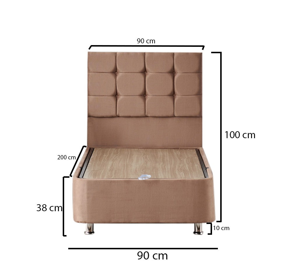 Colchão de solteiro de luxo com estrutura de aço e cabeceira, marrom claro, 90 x 200 cm | Ortopédico completo, sistema de molas múltiplas, inclui baú e trava de segurança