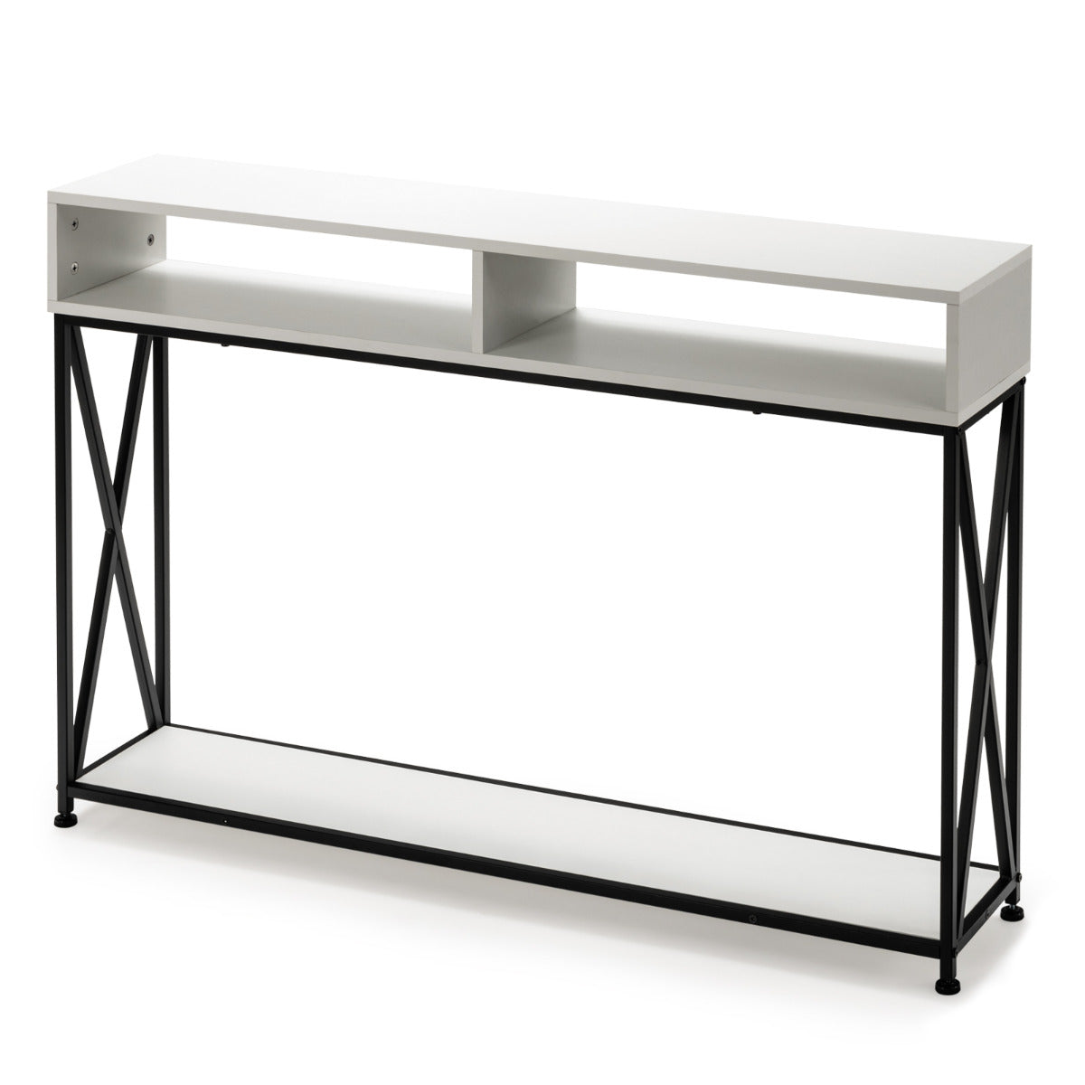 Procura uma solução para organizar a entrada? Experimente decorá-la com esta simples consola. Esta mesinha com prateleiras abertas oferece muito espaço para colocar carregadores de telemóvel, chaves, livros e muito mais. A estrutura em metal em forma de X é durável e garante estabilidade. Os suportes antivuelco e pés ajustáveis são excelentes para manter o equilíbrio. Além disso, a superfície é à prova de água e resistente ao desgaste, sendo fácil de limpar. O design bonito combina bem com o estilo decorativo da casa. Perfeita para colocar na entrada, atrás do sofá ou contra a parede da sala.