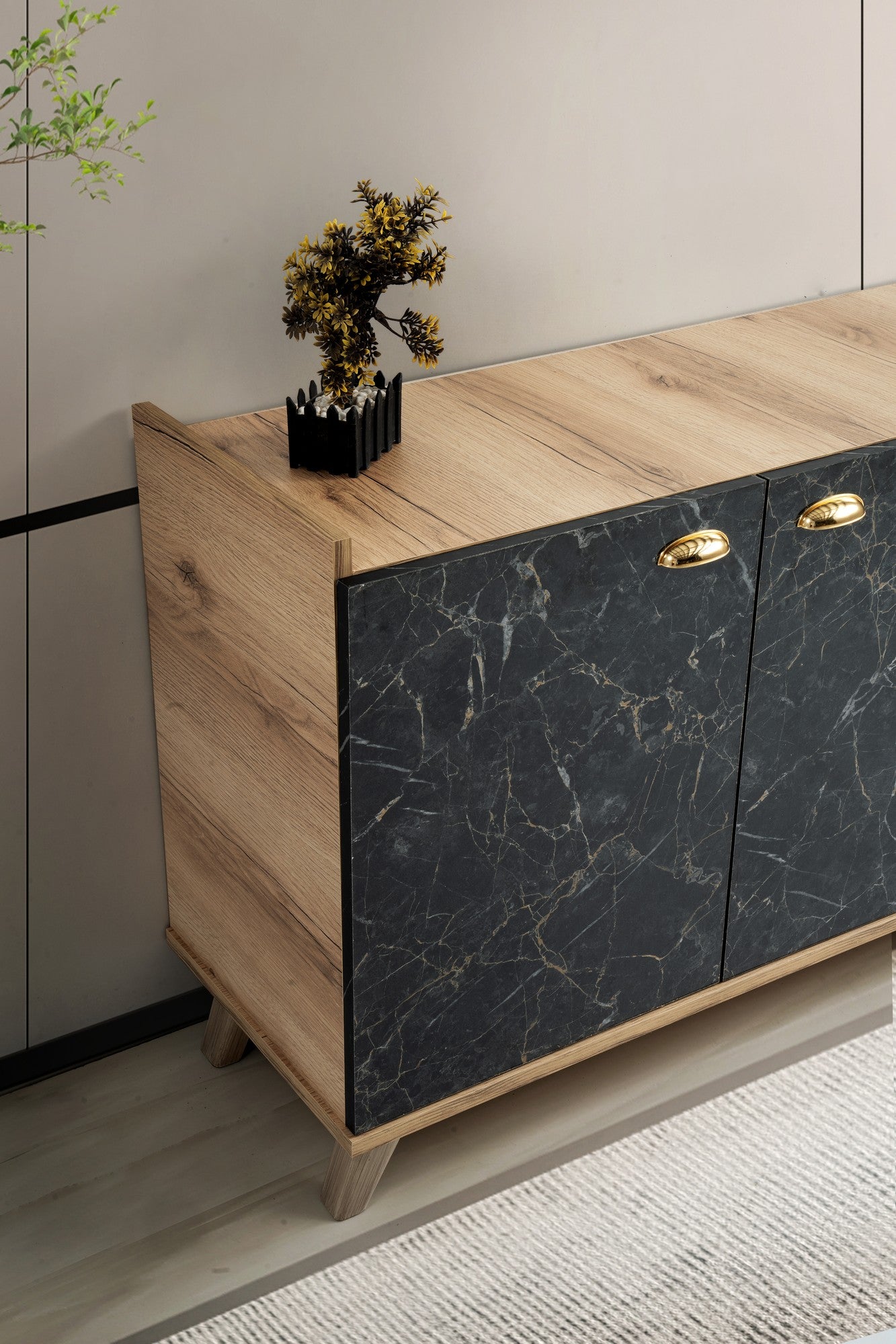 A combinação de cores de carvalho e mármore confere a esta consola um aspeto luxuoso e sofisticado. O acabamento em madeira natural acrescenta calor e carácter, enquanto os detalhes em mármore exalam opulência e requinte.