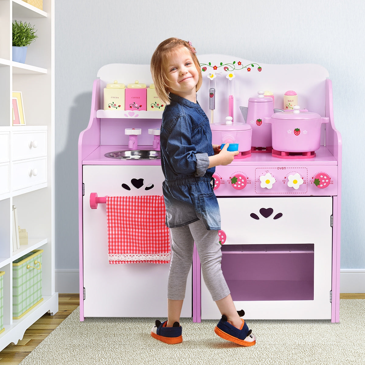 Cozinha de Brincar para Menina em Madeira Rosa Morango Forno Jogo Infantil com Acessórios