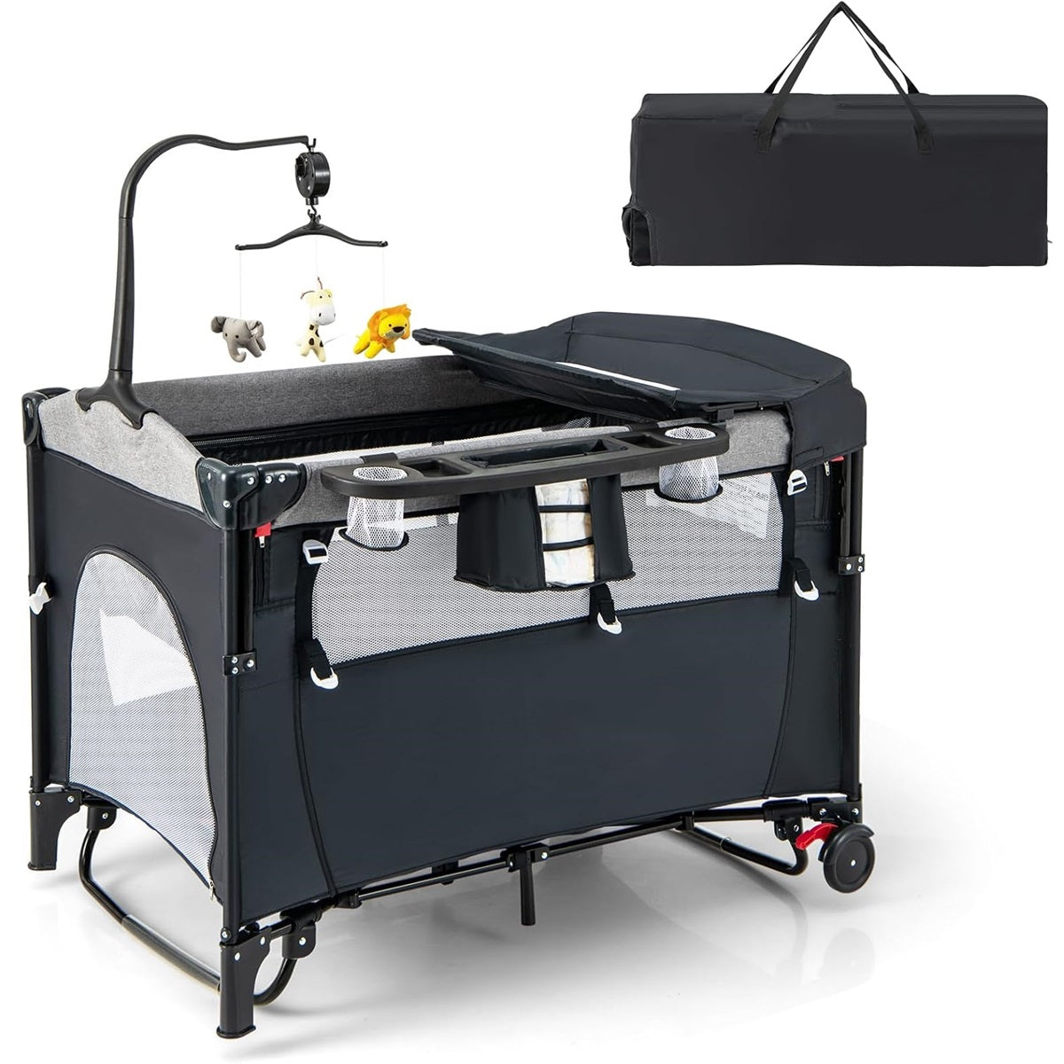 Cuna de Viagem para Bebé 0-3 Anos com Trocador Colchão Brinquedos Pendurados Caixa de Música Altura Ajustável Rodas Capacidade 15 kg Preto