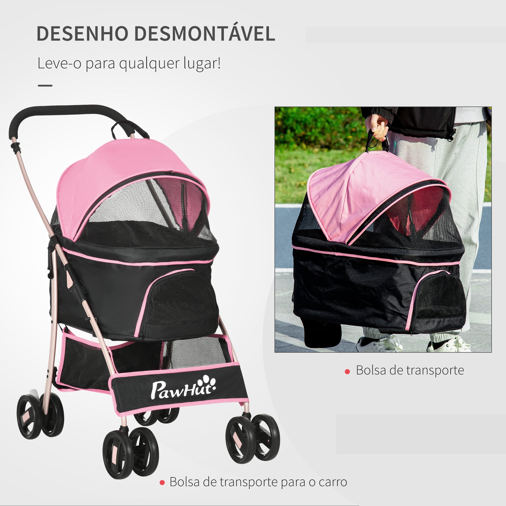 - Benefícios: Pode ser utilizado como carrinho de passeio, bolsa de transporte ou bolsa de transporte no carro, garantindo conforto e segurança para o seu animal de estimação