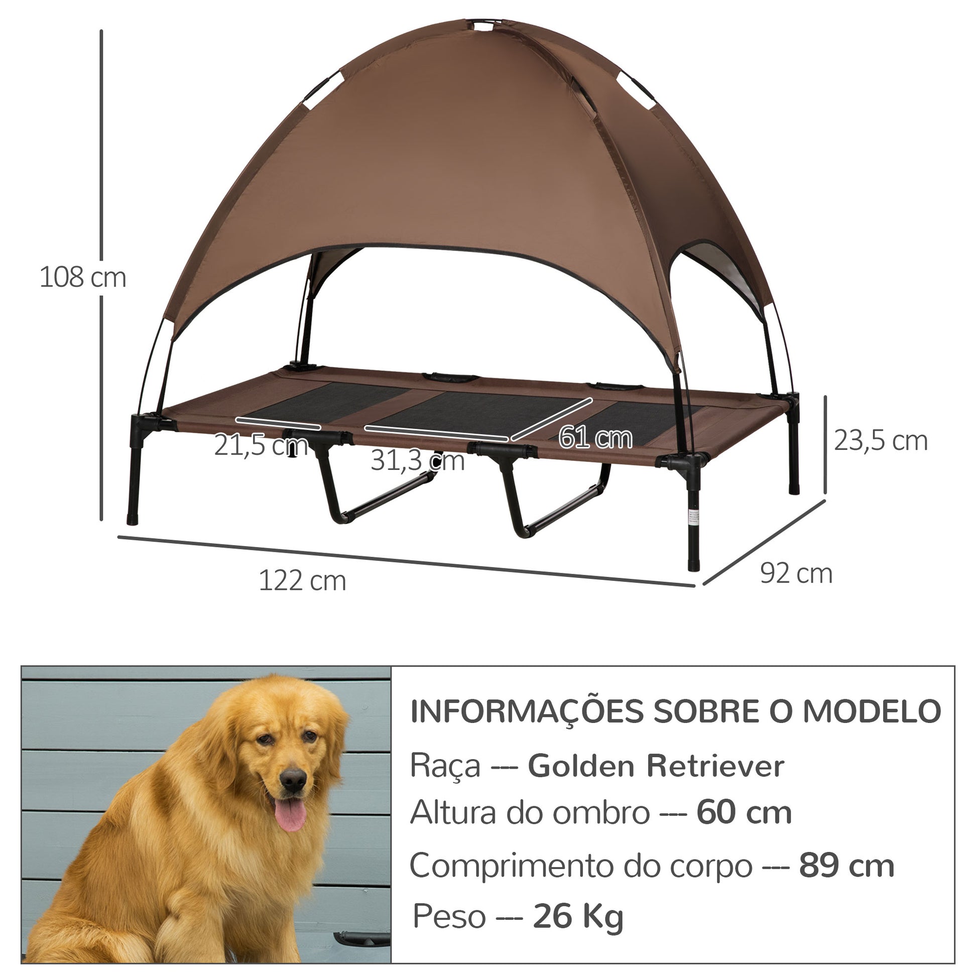 A Cama Elevada para Animais de Estimação com Toldo Amovível é perfeita para garantir o conforto do seu animal, seja no interior ou exterior da sua casa. Com medidas de 122x92x108 cm e na cor marrom, este produto oferece durabilidade e praticidade.
