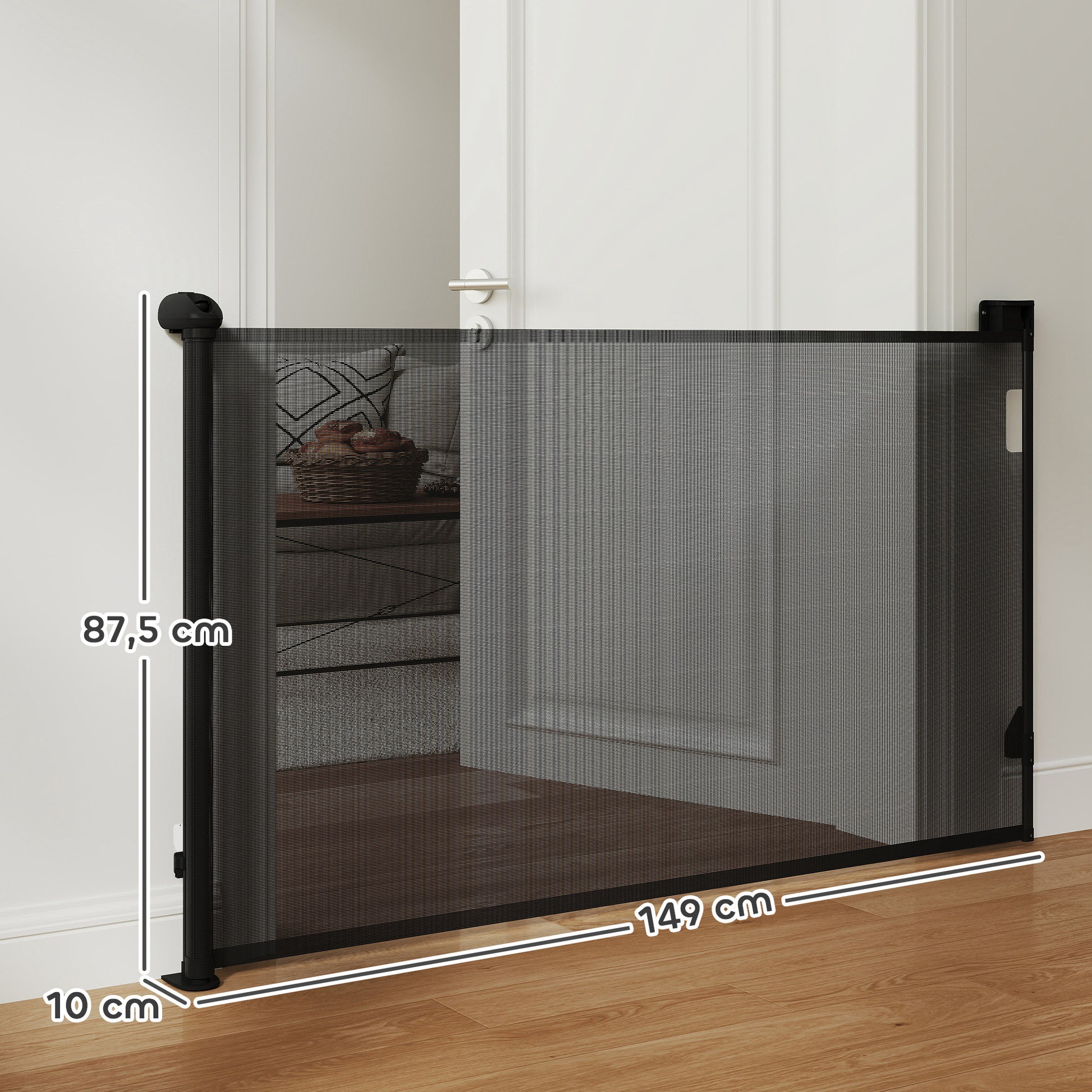 Proteja o seu animal de estimação com esta barreira retrátil para cães pequenos, com medidas de 149x10x87,5 cm e cor preto. Ideal para garantir a segurança em portas, corredores e escadas.