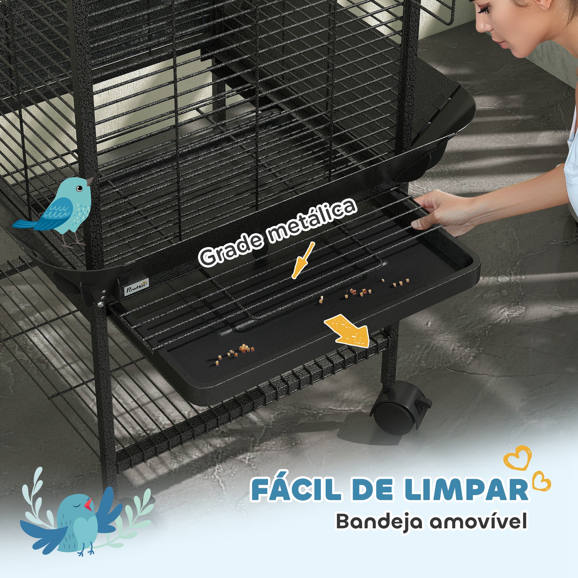 A gaiola inclui poleiros, tigelas e prateleira para manter seus pássaros felizes e seguros. A bandeja amovível e as rodas facilitam a limpeza e a movimentação da gaiola. Garanta o bem-estar dos seus pássaros com este produto durável e funcional.