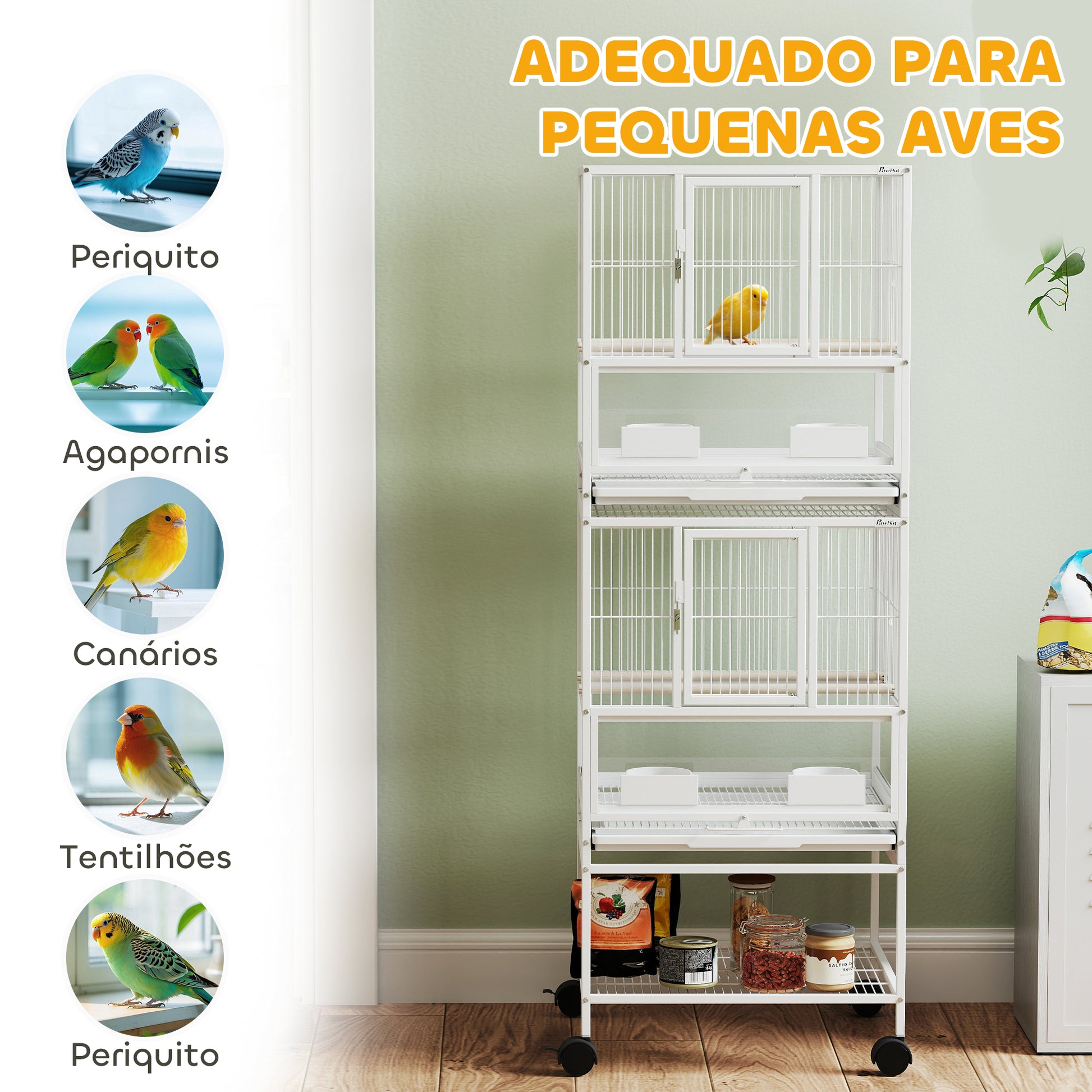 - Outras especificações: Poleiros de Ø1,5x48,5 cm; tigelas de alimentação de 9x9,5x5 cm; bandejas inferiores de 45x45x2,5 cm; distância entre barras de 1,2 cm; rodas de 5,08 cm.