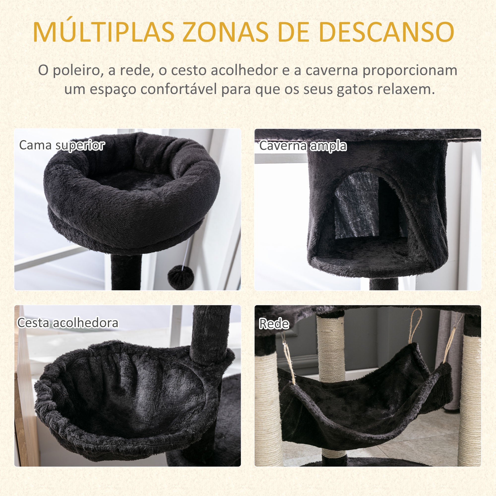 Deixe o seu gato desfrutar de diversão e descanso com a Árvore Arranhador para Gatos Grande Cinza de Carvão. Com múltiplas plataformas, caverna, redes, postes de sisal e bola suspensa, este centro de atividades é perfeito para manter o seu felino entretido e confortável.